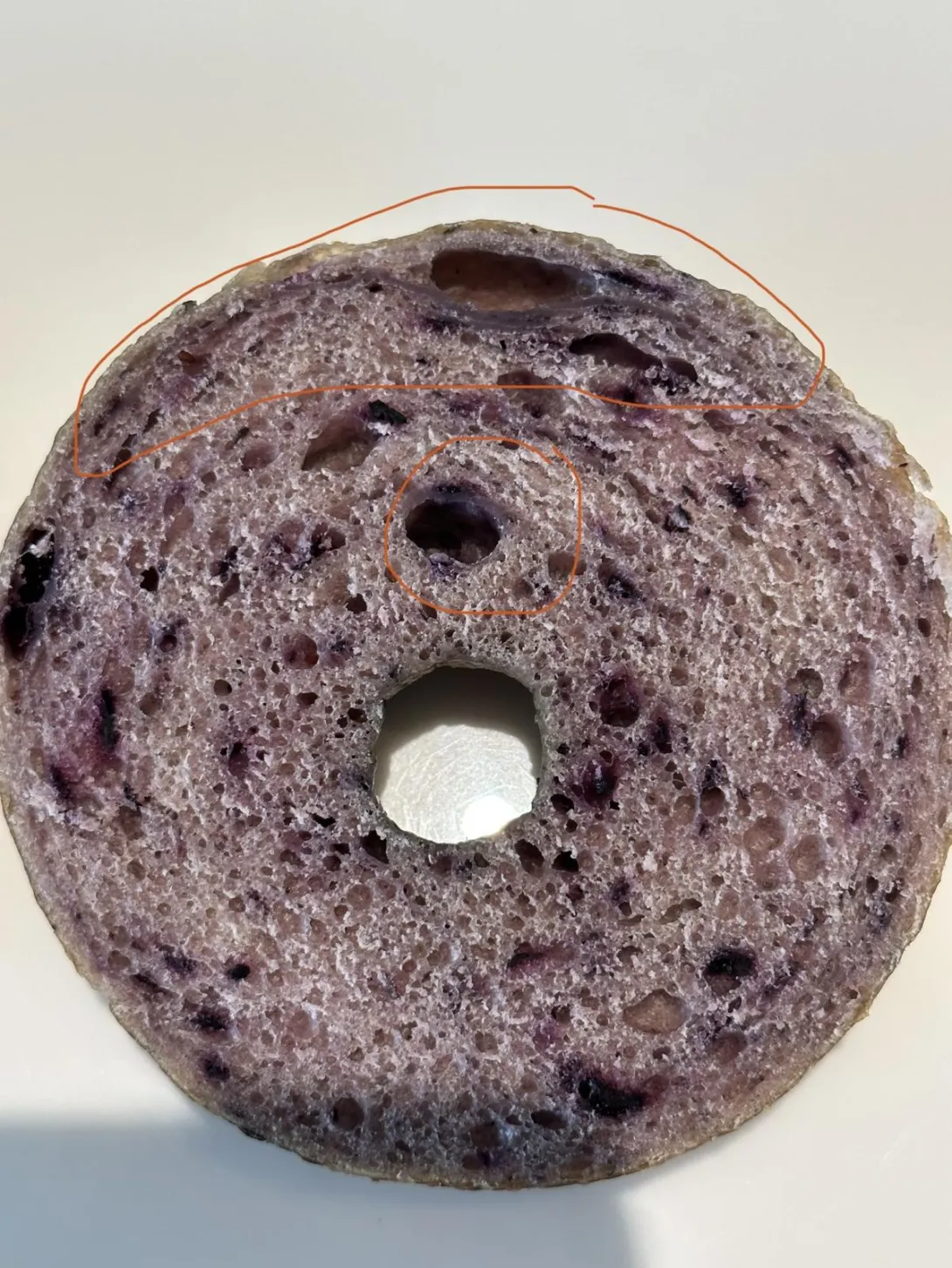 My sourdough blueberry bagel has these gummy spots and line. Does anyone know what might have caused them? Were they under-proofed? I did not cut it while it’s hot.