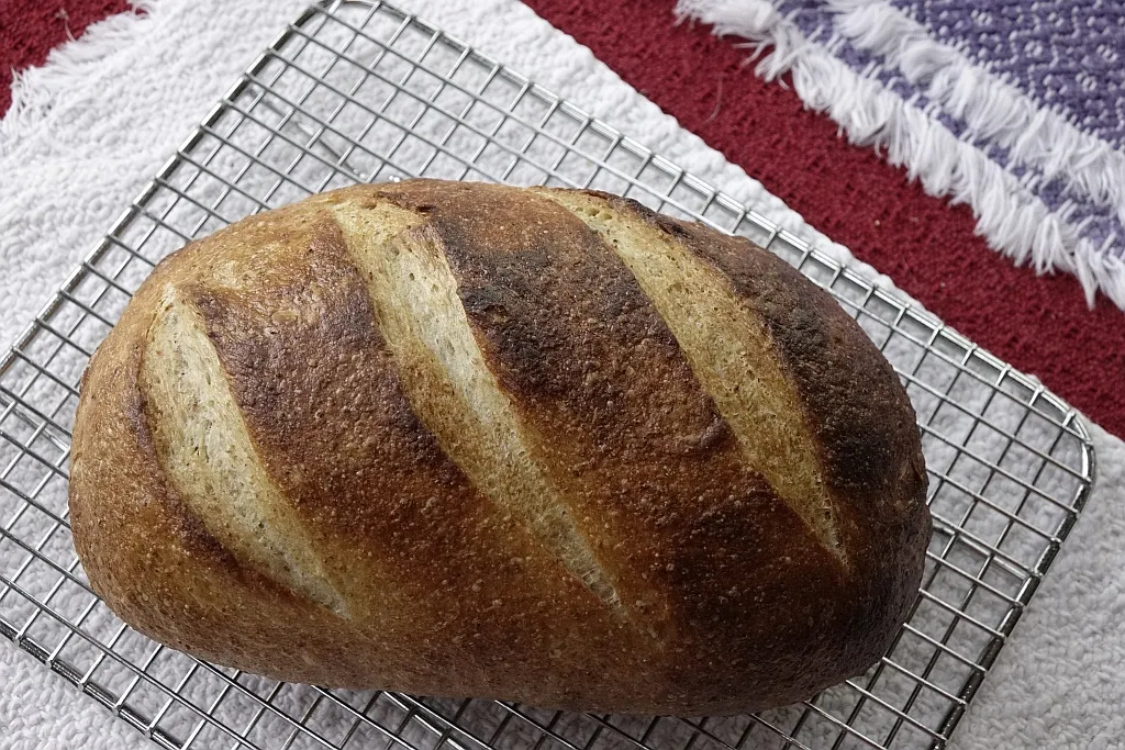 You will see in the photos that the loaf is not as evenly browned, but otherwise is very respectable. This loaf used 300g of flour - 5% rye, 10% whole wheat, King Arthur Bread Flour for the rest - 65% hydration, 8% inoculation leading to long fermentation times. It tastes good, too!