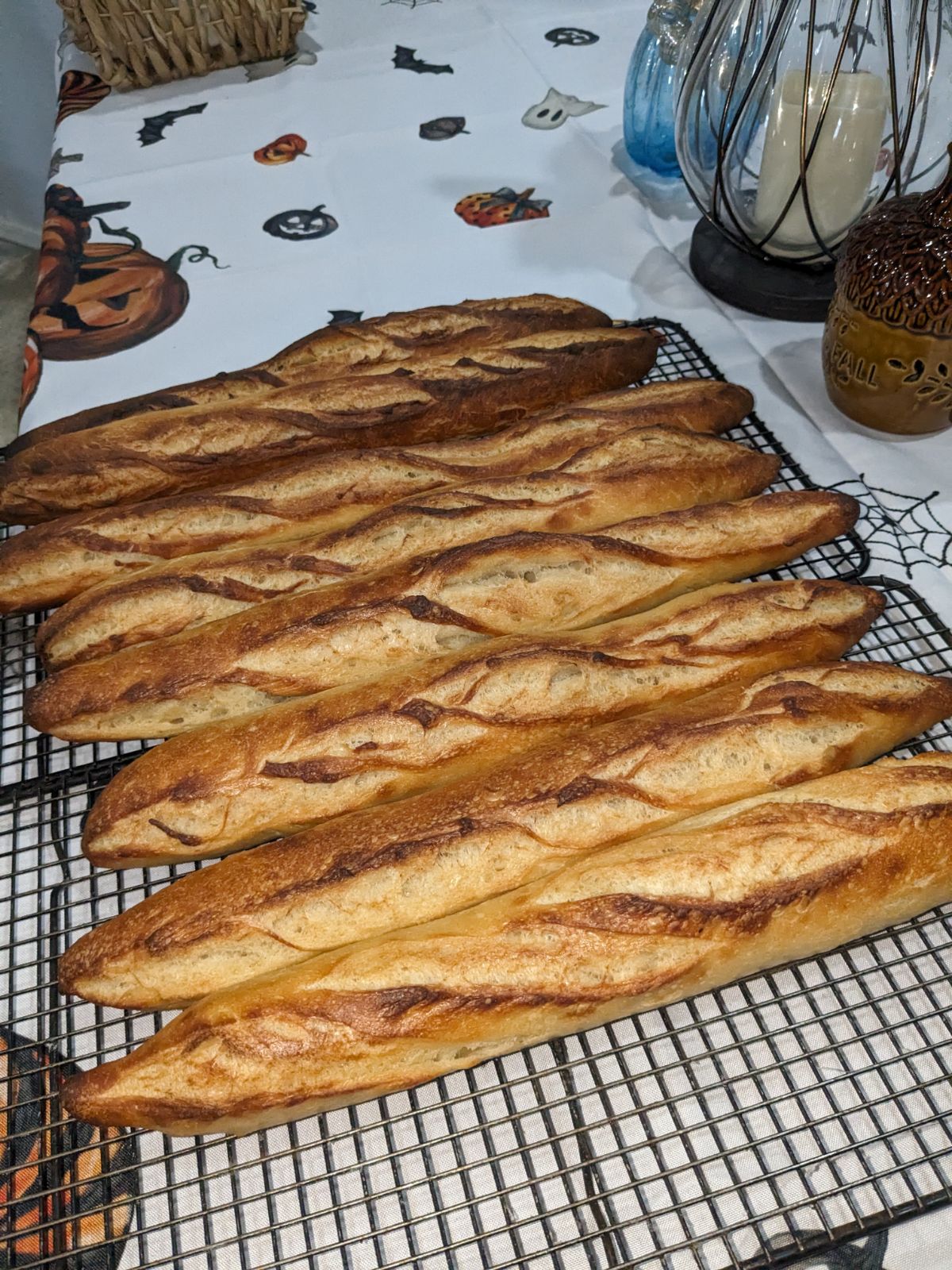 it's not easy getting a baguette bake of this size to be perfect. With only one oven I was rushing to not over proof. A couple are terribly misshapen. The last at two in the oven were two shades too dark. (Not pictured) Six of ten were perfect. Not a good outcome. That being said. I sold four, enough to cover expenses. Like anything else practice needed.