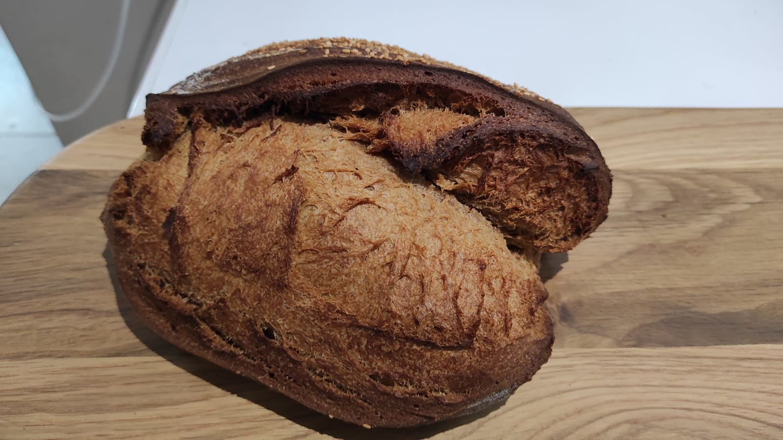 I messed up the baking! Because the dough felt fairly robust and not slumpy in the banneton I assumed it would bake the same as a normal loaf and this wasn't the case. I baked it side by side with a regular sourdough and that was a mistake - my habit is to turn the loaves when I remove the steam trays after 20 minutes and this bread was still very wet and loose and should not have been turned, and this turn seemed to knock it into a strange and wonky shape. Perhaps I should also have given a few small scores rather than the single 'ear' type score as well to contain some slumping. It did get an extra 15 minutes in the oven with the door cracked open afterwards, but certainly this bread should have been baked more carefully, as one does with a wet slumpy dough, and requires at least a full hour of low and slow baking with foil tenting.