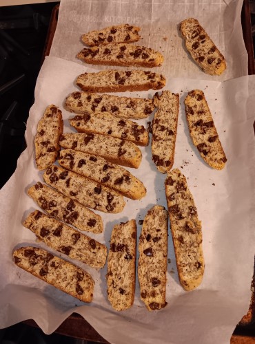 The biscotti that I made came out pretty good. I did this November 4. on The only thing is that I should've sliced them a little thinner or baked them longer. Or both. the recipe I used is from Joyofbaking.com: Chocolate Almond Biscotti. The only changes I made were to use toasted pecans instead of the almonds. The dough was a little tacky.