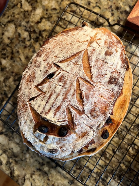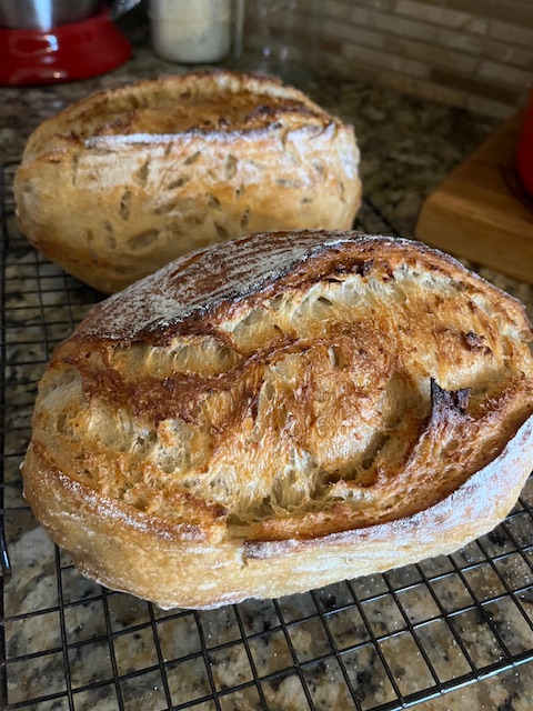 I’ve been enjoying baking with my King Arthur sourdough starter so much this fall! I’ve settled on a recipe that I love for my basic bread, the Taste of Artisan no-knead sourdough. It’s a 70% hydration recipe that works very well as an overnight room temp proof. I start the dough around 4-5pm, do several stretch and folds every 45 minutes until around 9pm, then let it sit on the counter until morning. Divide, shape, and place bannetons into the fridge for at least 2 hours. Score, and bake in preheated cast iron dutch ovens at 450 for 25 minutes covered, 10-15 minutes uncovered (internal temp is between 205-210).