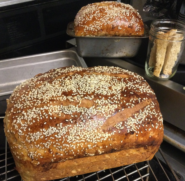 This large loaf uses some (6.4%) roasted jalapeño pureed with a bit of raw onion which counts as part of the total liquid (70% hydration). 1 whole egg is also counted as part of total liquid.