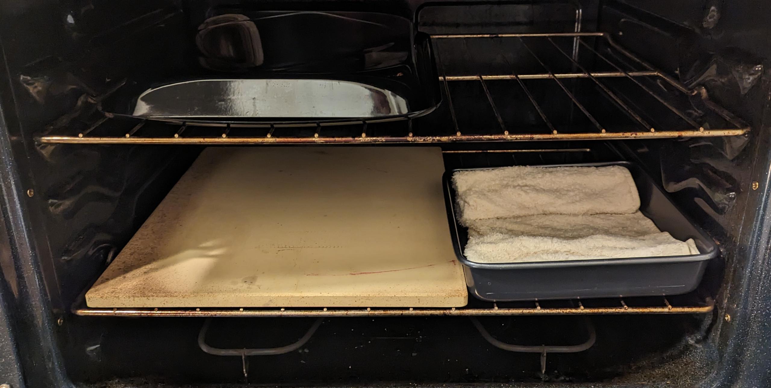 After my previous baking stone adventure, I thought I'd try out the towel steam method to see if I could improve upon those bakes. I'm pleased to say that tonight's loaves didn't burst on the bottom! In addition to the steam pan with the towel in it, I also put a pan upside down above the baking stone as a way to trap steam and shield from the upper heating element.