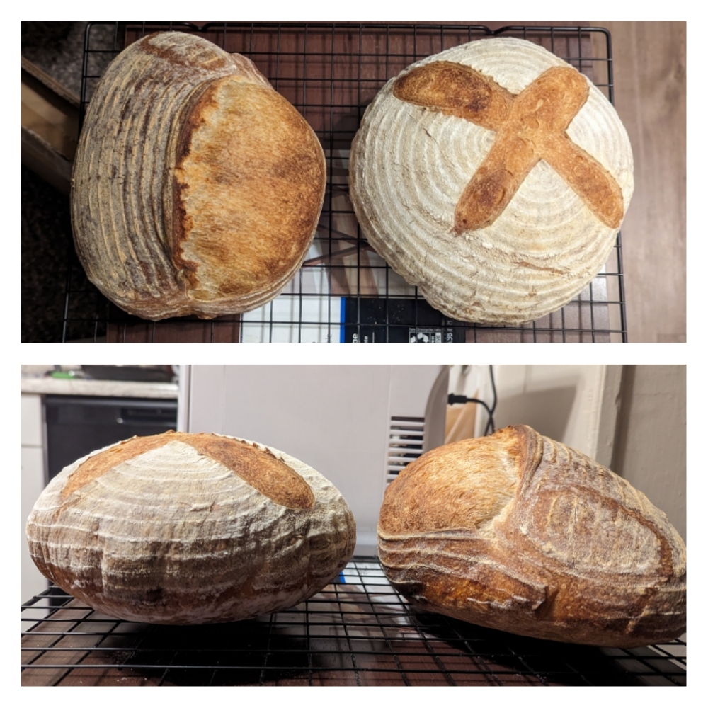 Now that I'm looking at the batard photos again, the scoring was kind of on the side rather than the top of the loaf, which could explain why it expanded a bit sideways (in addition to normal oven spread).