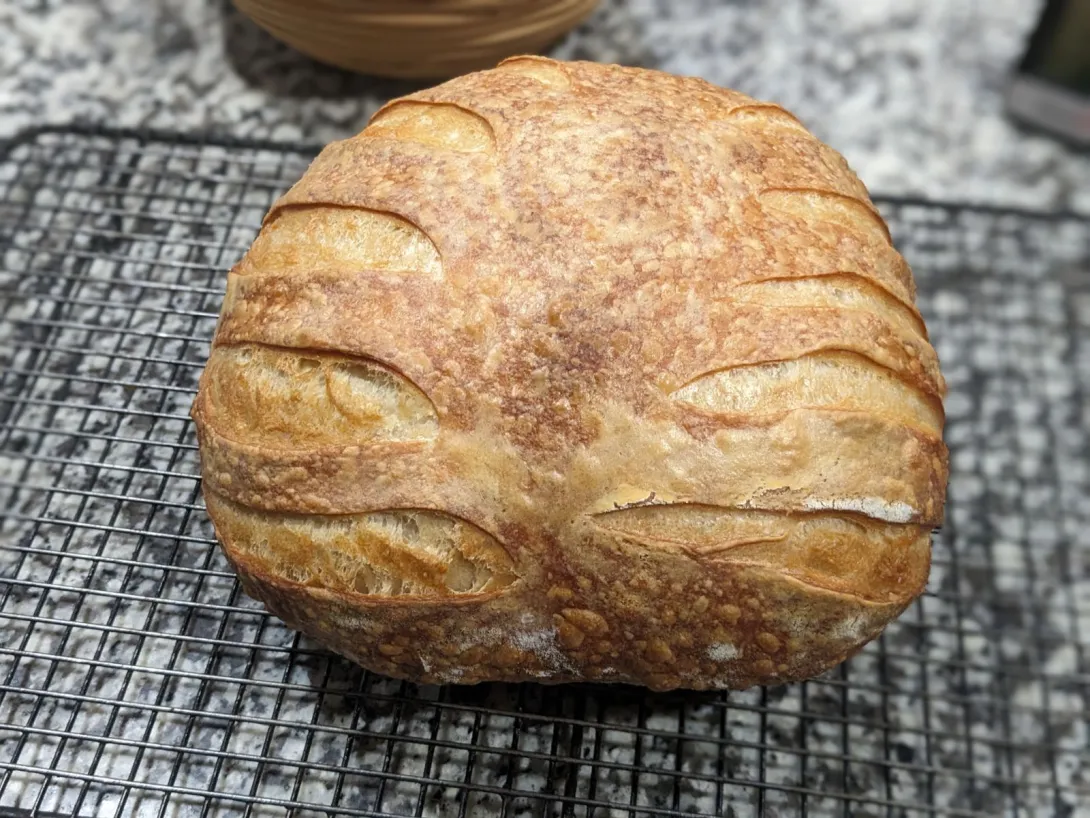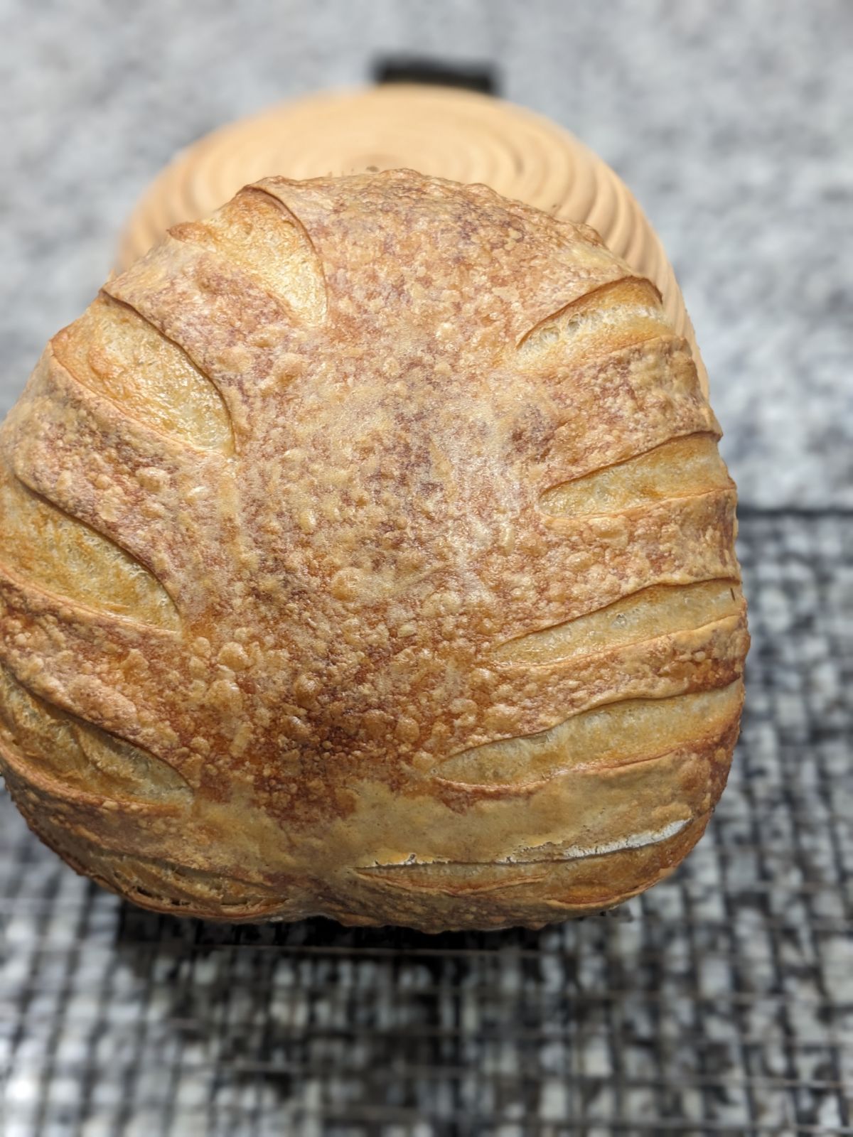 The one bright spot that gives me hope is the absence of the pyramid misshapen end product. Indicating that few or no unspent yeast are attempting to exit though the top of the boule. More in regards to the shape. My feeling is that the turkey like shape is a product of my chosen score. I had a plan to do this bulk fermentation ta my current room temperature for as long as it took. At the last minute I changed the plan and heated the mix water to a achieve a 85°F end dough temperature at the beginning of bulk fermentation. I really should stick to one plan.
