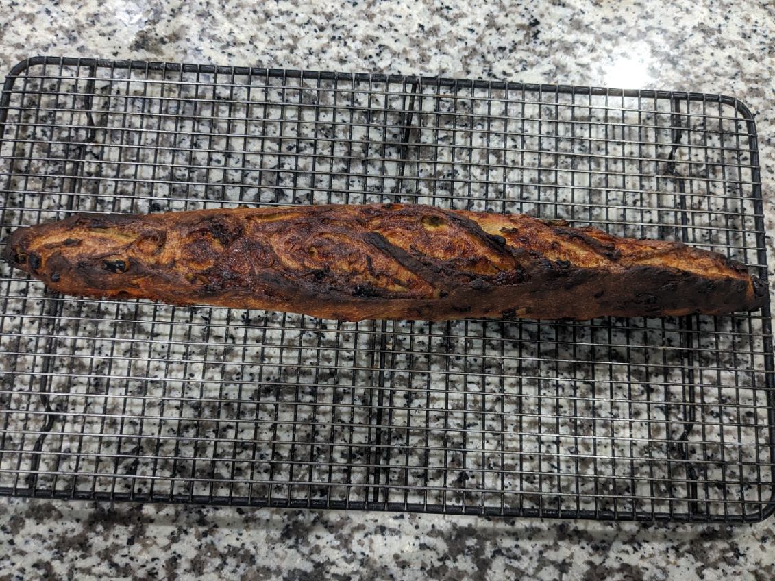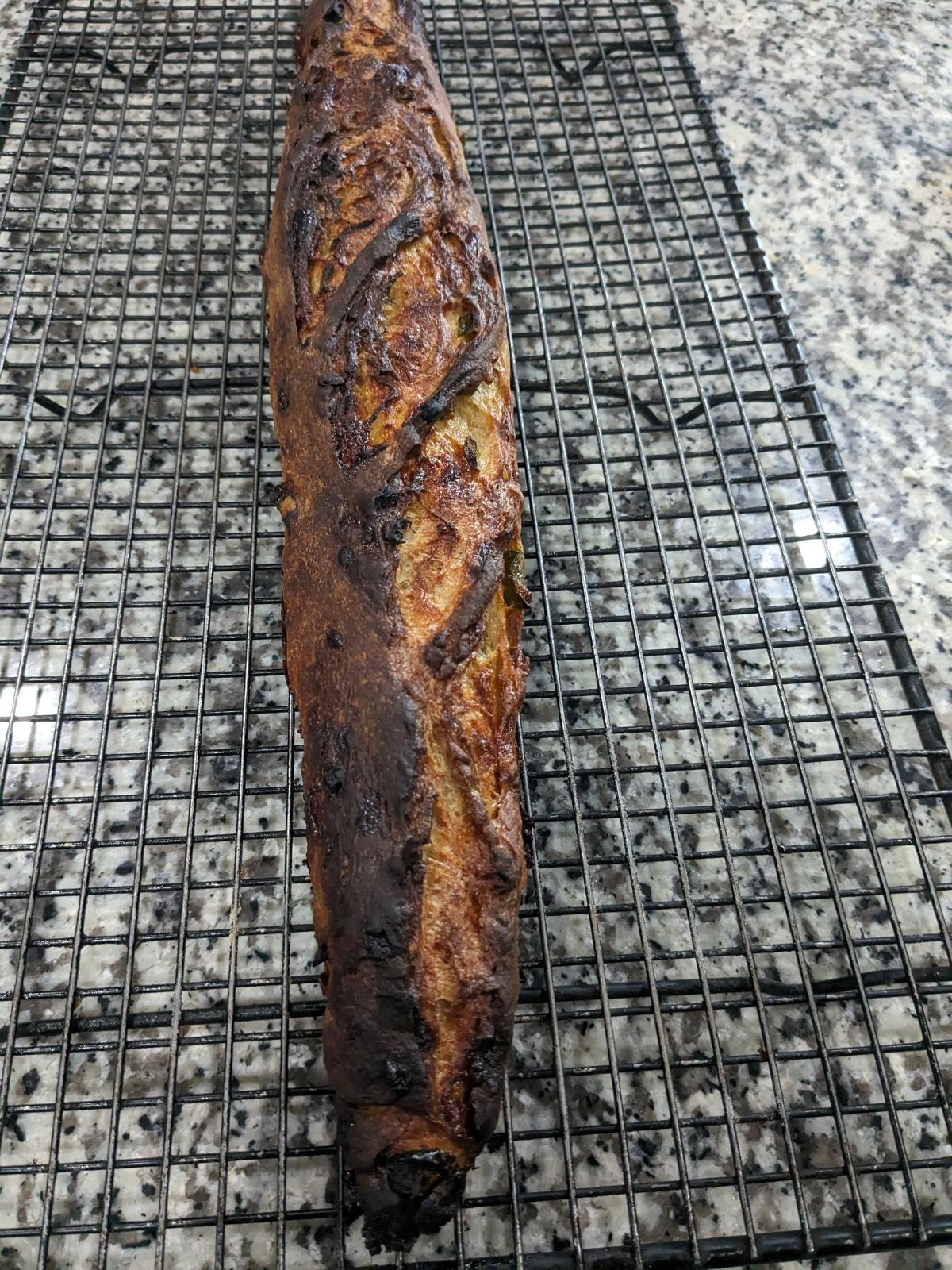 What a huge let down. I got involved in making a pizza to go in the oven right after the one baguette. Don't you just know I forgot to turn the timer back on after I spun the baguette and released the steam from the oven.  The result is ugly. To be fair, I think the sugar in the cowboy Candy played a role. I will have to watch tomorrow's bake like a hawk. Maybe lower the temperature after the first 15 minutes and cook a bit longer? Don't watch if you don't want to see a grown man cry!!!
