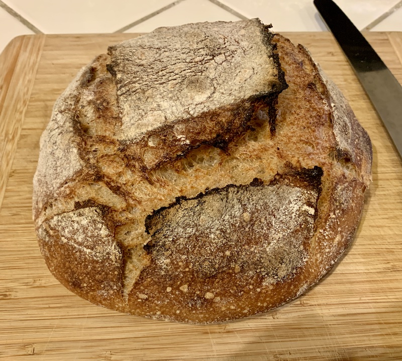 Both loaves were proofed for 50 minutes at room temperature. One was then baked after another 45 minutes of proofing. The other was refrigerated for about 18 hours, then warmed at room temperature for an hour before baking. Both loaves were baked in Lodge Combo Cooker cast iron Dutch ovens for 30 minutes covered at 475ºF. The loaf baked the without retardation was baked another 15 minutes uncovered at 460ºF. The retarded loaf which was a bit bigger was baked for 20 minutes more uncovered at 460ºF.