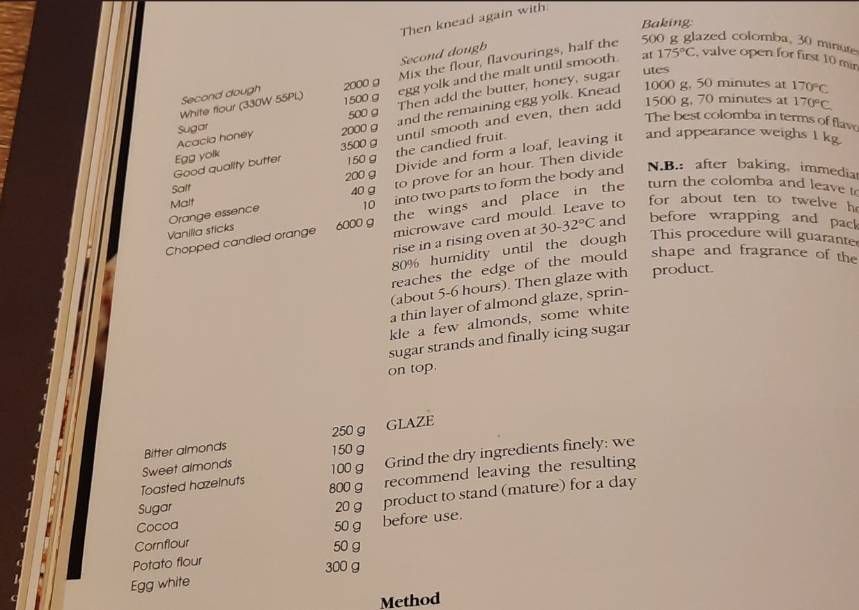 2. Baking: Don't put the pans on a baking sheet, as the bottoms will either be burned or not as done as the rest of the cake. Because of the shape, Colomba bakes in less time than panettone. There is a balance between baking slowly enough for optimal dextrin formation, and fast enough to achieve good oven spring. Baking on a preheated stone seems like the best option to achieve both.