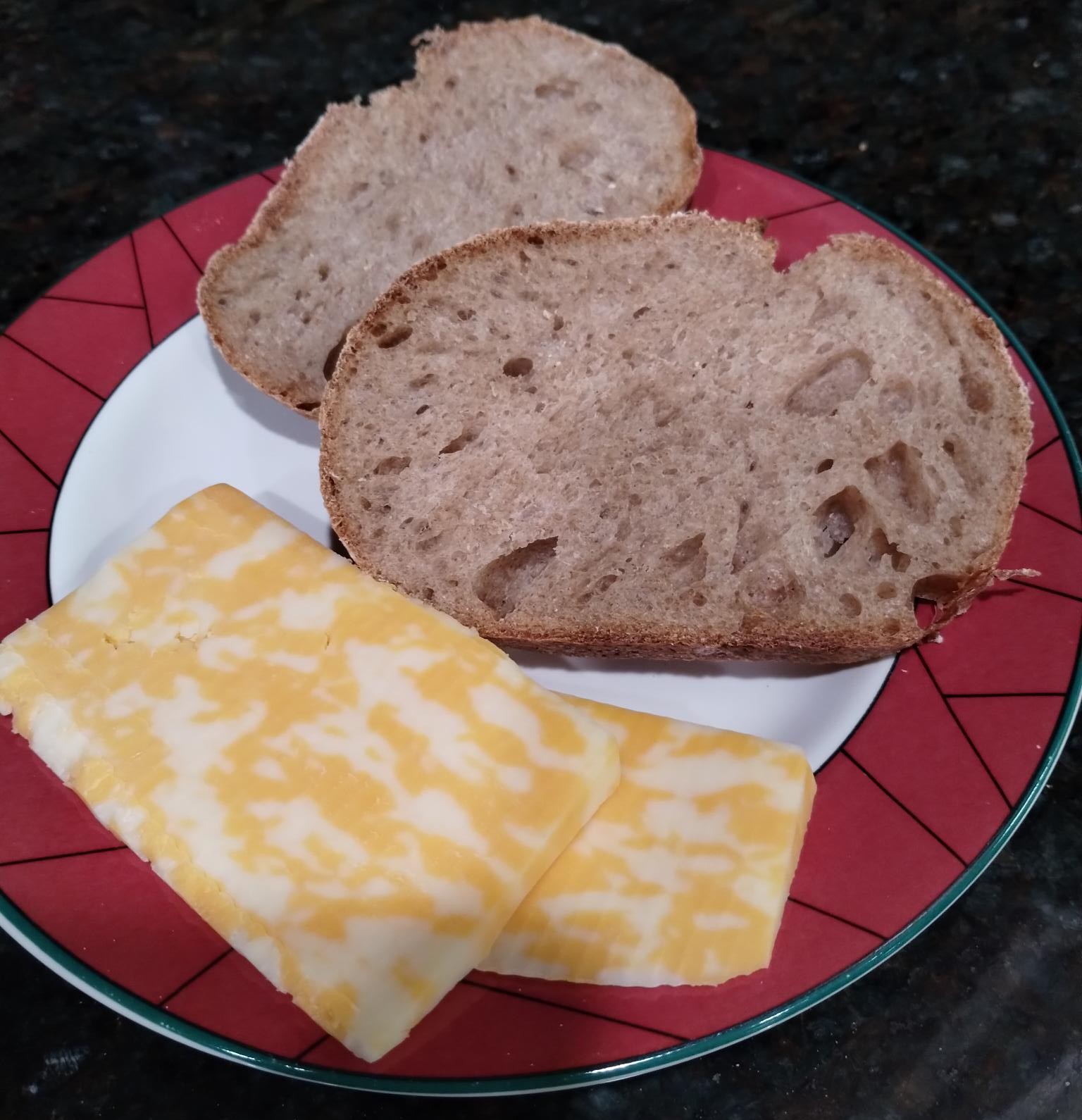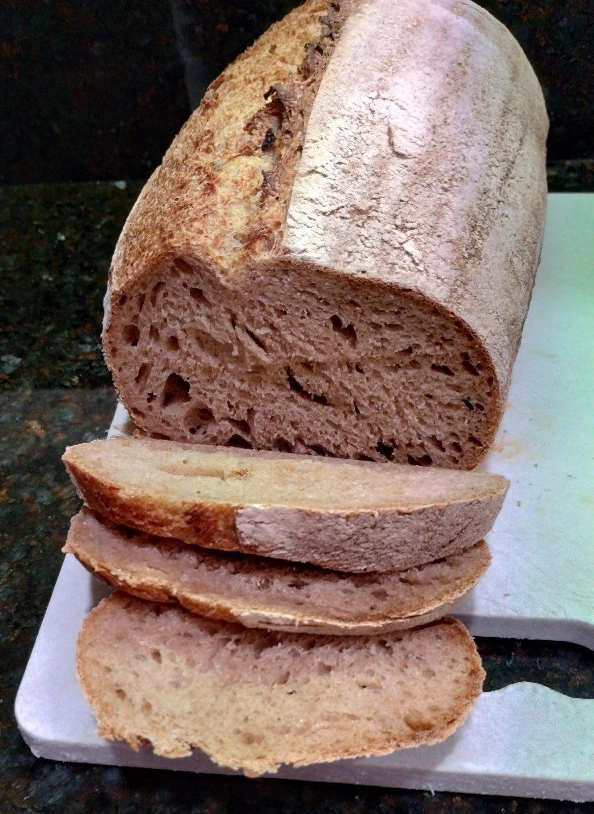 It has been a while since I did anything creative with my bread making. If there is such a thing as a "comfortable rut", our usual 75-100% whole grain sourdough sandwich bread has been just that. With the pending visit of a family member, I was inspired to dust off the clay baker and do something more creative for her. My scoring skills are rusty could use some work (they were never all that great really), but otherwise it looks pretty good so far. It's cooling at the moment; I'll edit and add a crumb shot later as time allows.