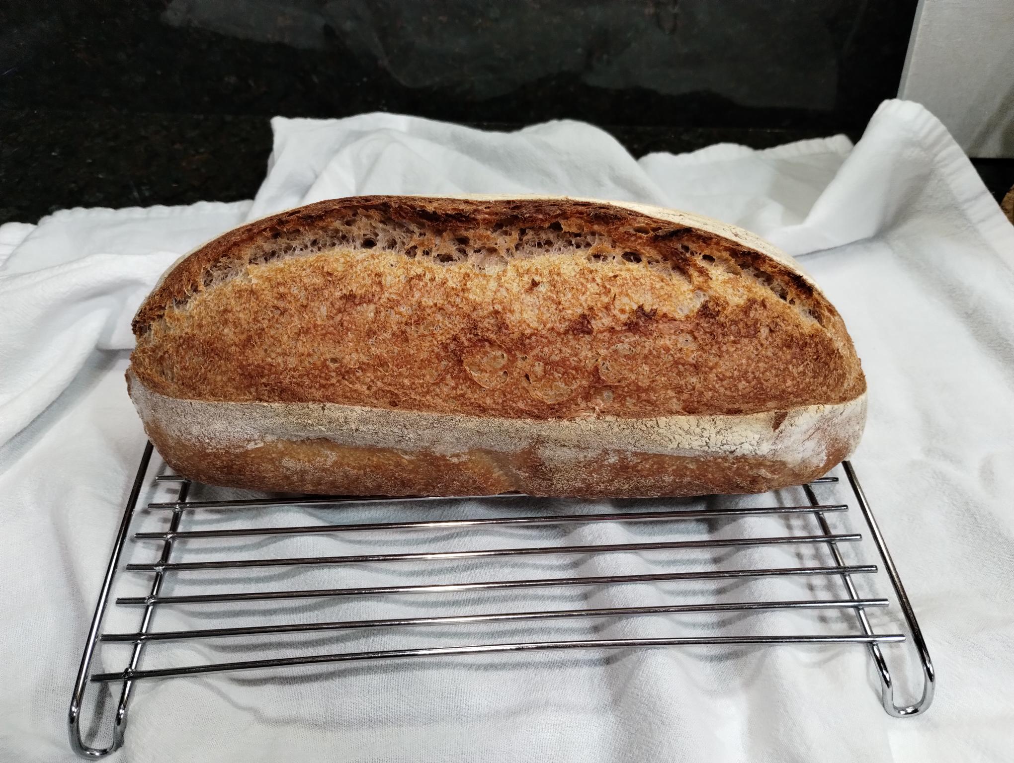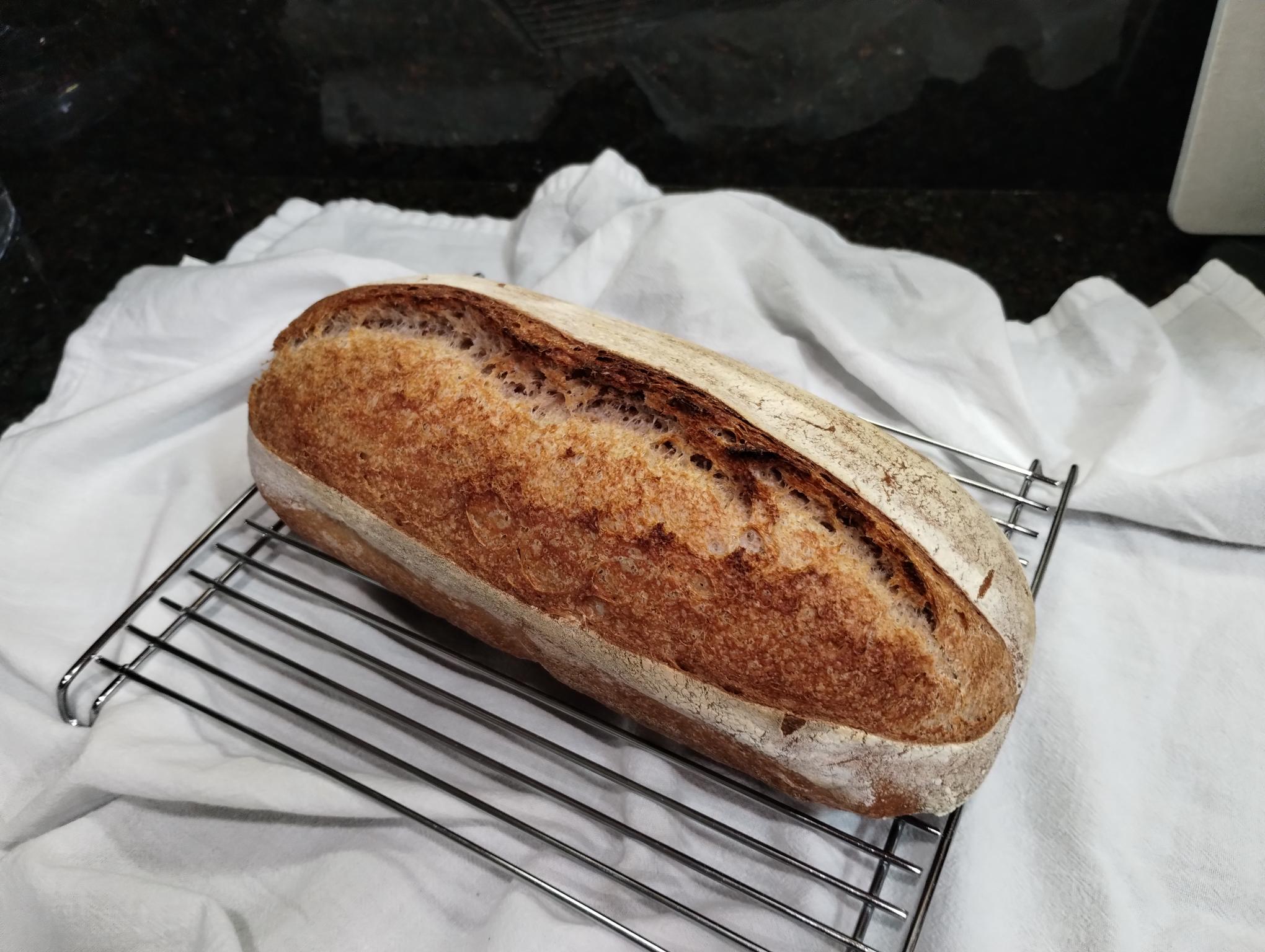 Baked today (after 20 hours of cold retard) in an oblong clay baker at 500f x 20 min (lid on) then 450f (lid off). It's cooling at the moment.