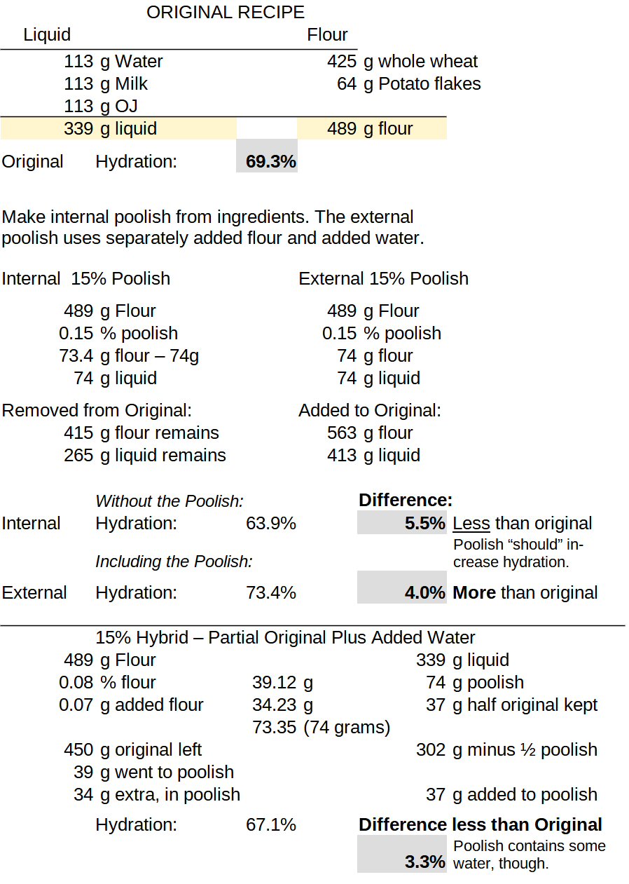 Everyone explains that making a poolish uses portions of the water and flour from the original recipe. But nobody writes out the hydration calculation before-and-after. Nobody is talking about “vanishing water or flour.” And nobody is saying anything about where that missing 5% of hydration may have gotten off to! Because...they don't think it's missing!