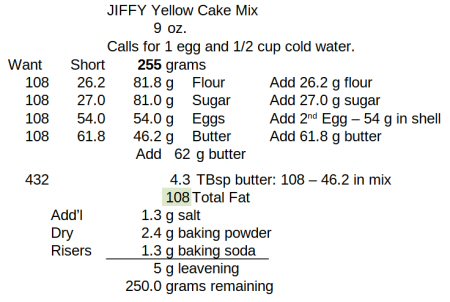 Jiffy mixes have been around since 1930, introduced by the Chelsea Milling Company. I figured they know what they're doing, and probably have a "basic" yellow cake. But I wanted to know how much of what ingredients likely are in the package.