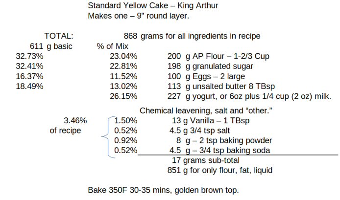 King Arthur also has been around a long time, and has become what Gold Medal used to be. If I could find a KA recipe for a yellow cake, I could work out "typical" percentages, then apply them to the Jiffy mix.