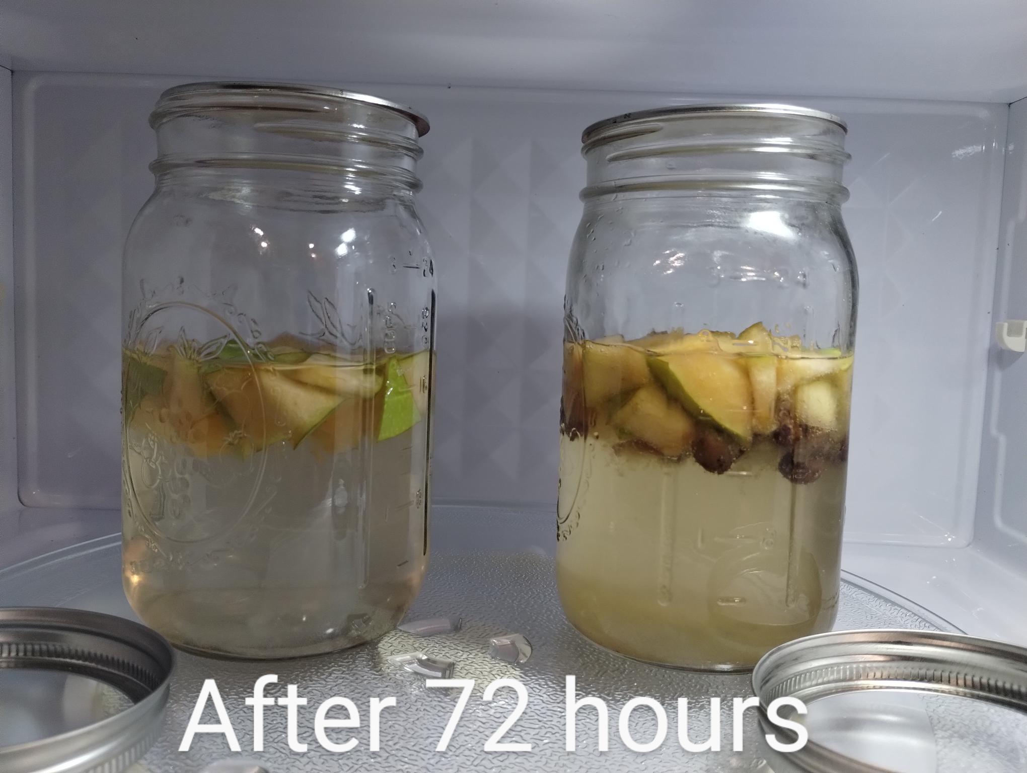 Today, at 72 hours: Both still smell good. And the raisins are now all floating. Both are developing a white, cloudy sort of residue at the bottom, moreso in the raisin one. Both still smell wonderful! No fizz yet: