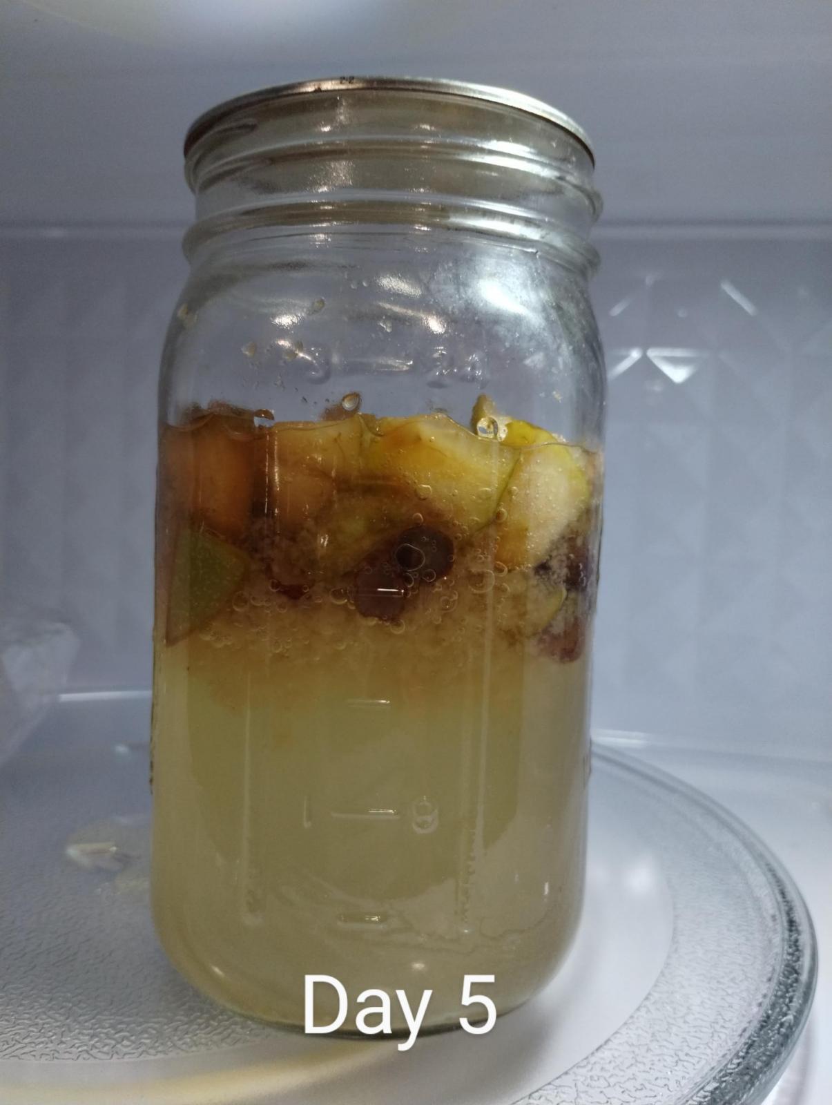 Meanwhile.... some logistics questions. After another stir and "air exchange", I put it in the fridge (loose lid) for now. The apples are slowly getting mushy and the YW is a little cloudy. Is it best to leave the fruit in ? Do you filter the YW somehow before using? With a tea filter or?