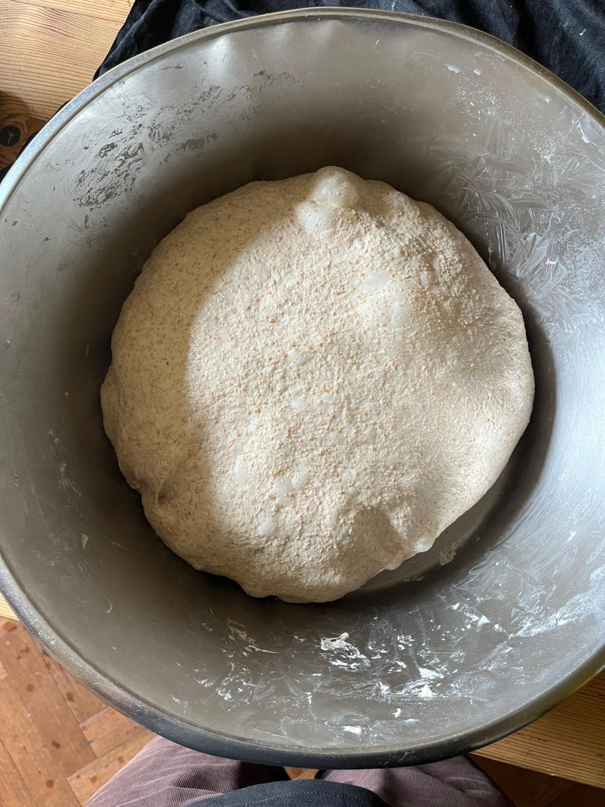 Taking direction from the comments, however, I mixed 1700 g of flour (50% strong white bread + 50% wholemeal) with 1300 ml of water (76%), and 14g of yeast (0.8%) and 25g of salt. Kitchen temperature is around 20 degrees at the moment. I let it sit for 45 mins. Folded after 45 mins, then a coil fold after 45 mins and another coil fold after 45 mins. This is how it looks now. I am debating whether to let it double in size at room temperature now and divide and shape into the tins and let it rise and bake or put in the fridge and do this tomorrow. Most likely, going for the first one (just to see how it turns out). Will keep everyone posted. If anyone has any comments or suggestions, please do let me know :)