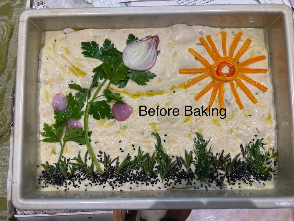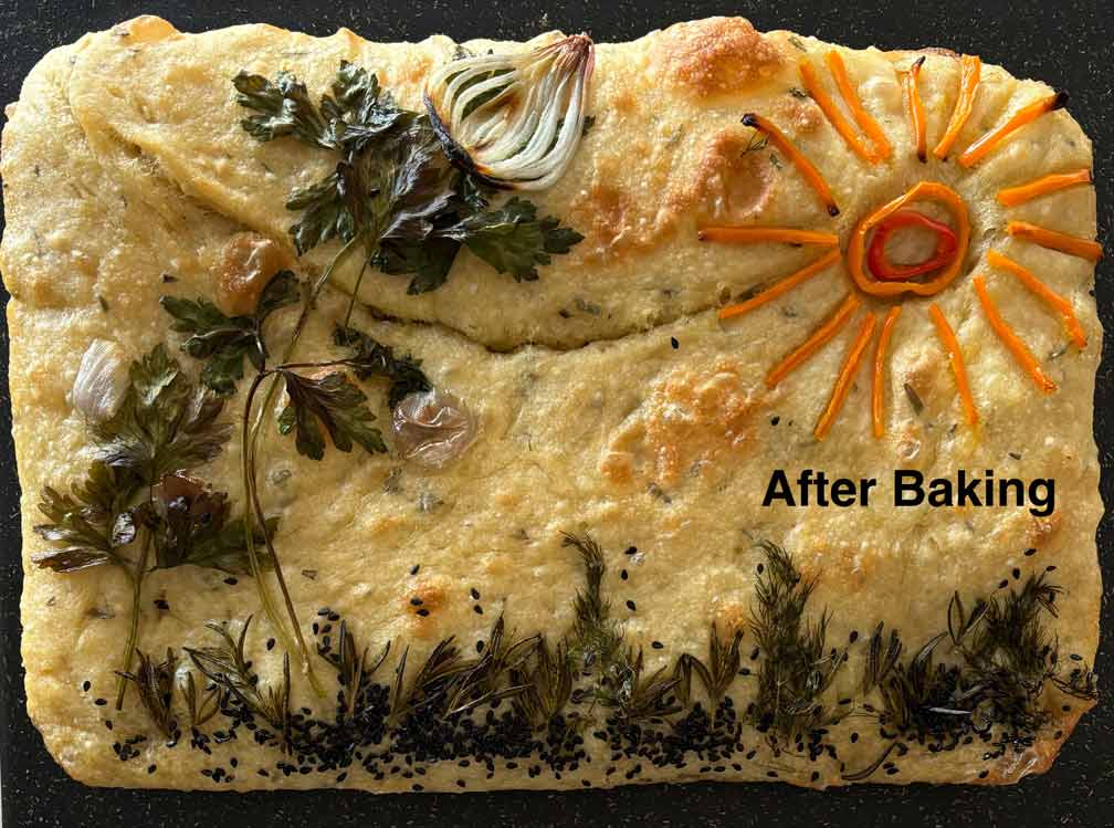 BUT I want to decorate it for gift-giving. When I decorate the focaccia with flat-leaf parsley, rosemary, shallot, etc the decorations wilt and almost scorch. (see attached pic)