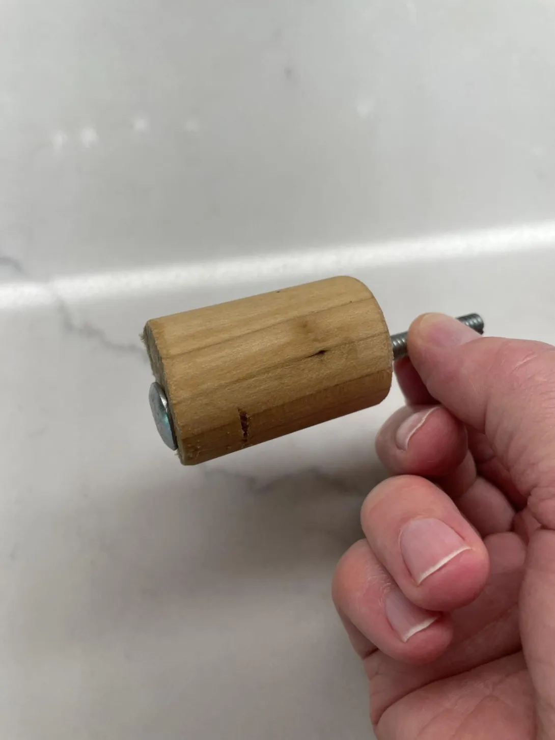 I love using my new Mockmill, but I don’t love the tedium of sifting. Remembering an older post that described using a massager to agitate a sieve, and not owning a massager, I wondered if I could get a similar result using my cordless drill. I took a scrap of 1 1/4 inch dowel and drilled a 1/4 inch hole off center. I inserted a carriage bolt through the hole. The resulting implement looks like this: