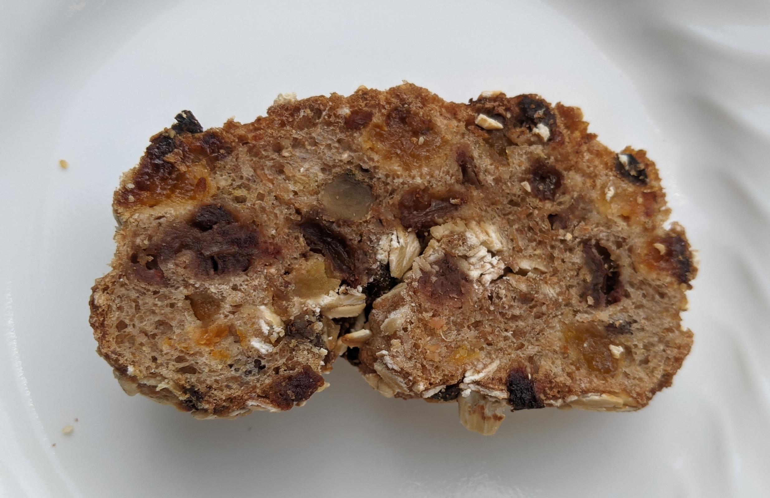 The loaf is encrusted with rolled oats, and comes pre-sliced 1/2 inch thick. The slices are a dense mosaic of evenly distributed fruit and nuts, with areas of crumb roughly equal in size to the included chunks. That's a lot of fruit. There are also unsoaked rolled oats visible, which are white and powdered where they were cut by the automatic bread slicer. This shows their distribution, which is in the shape of a swirl.