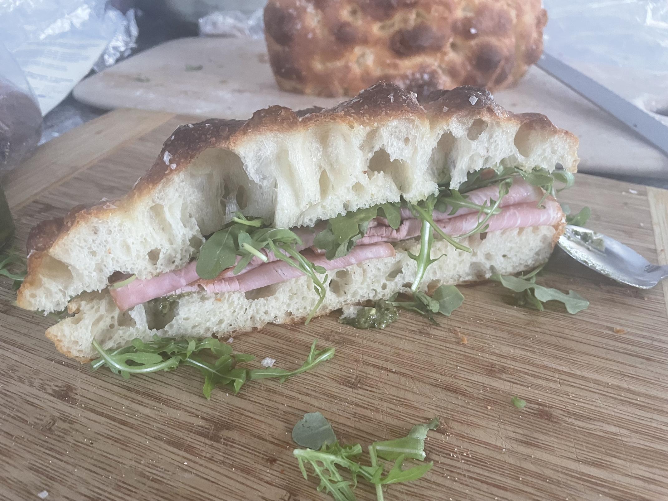 It tastes great and was easy to make. I did an overnight proof in the fridge and baked it in a 10 inch cast iron skillet. Most of the loaf didn’t survive first contact and was gone before the sunset. Ham, pesto and arugula sandwich was the first thing made from it. It was good plain with jam or a smear of Nutella. I will be making this again!