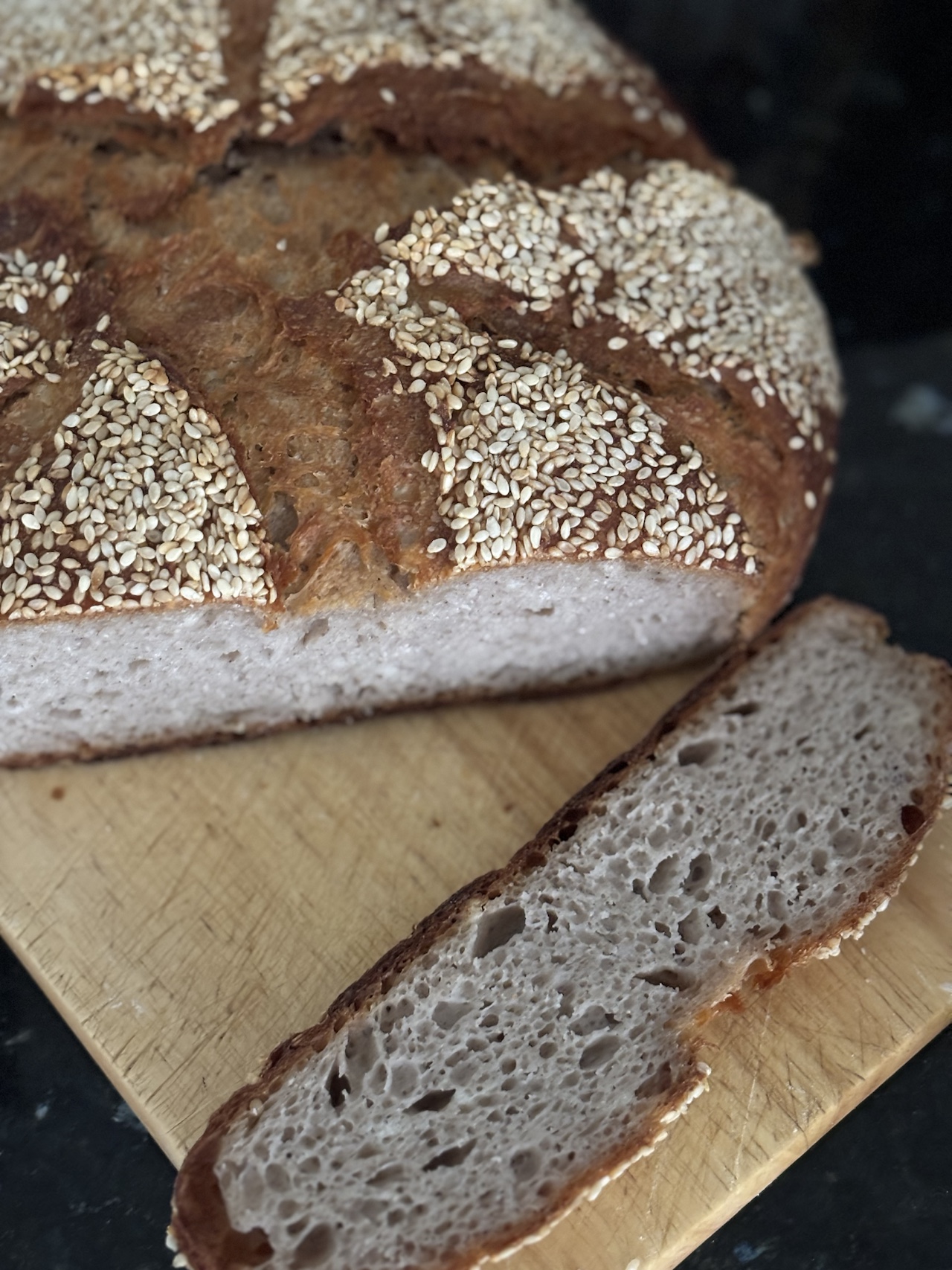 33% Buckwheat, 67% white flour, PM, sesame seeds on top.