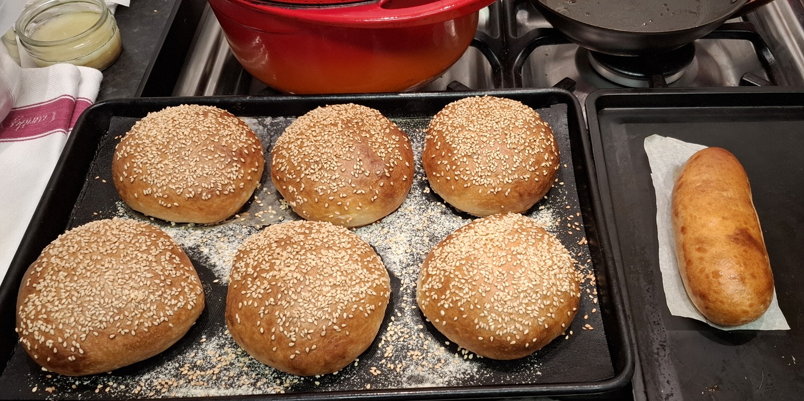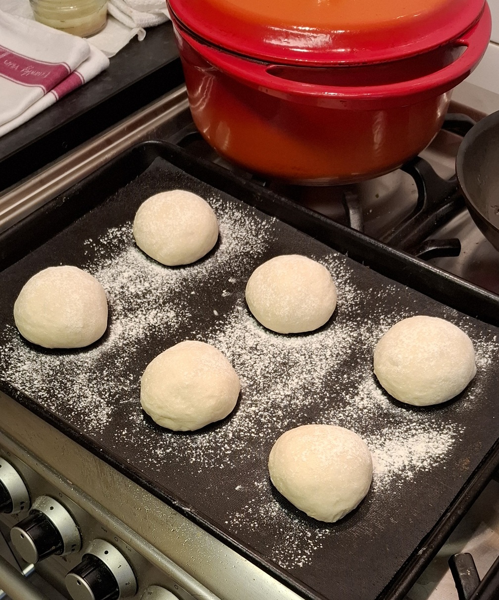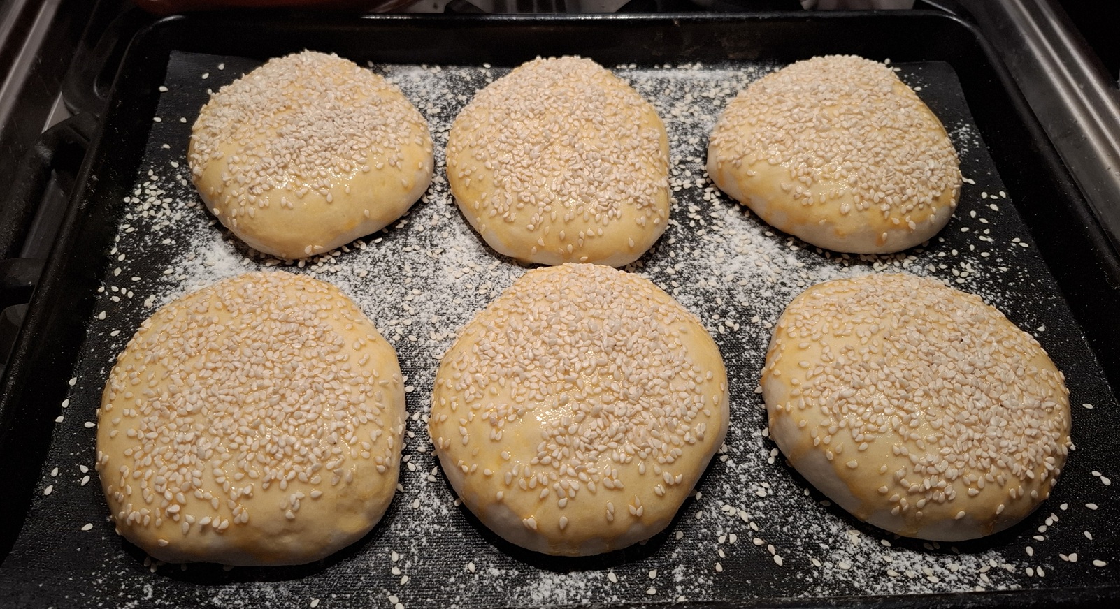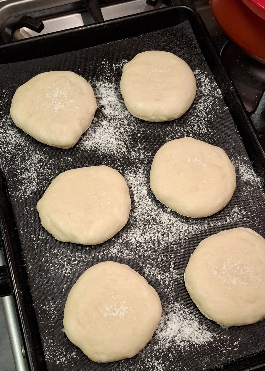 Dough divided, buns were rounded and placed, well-spaced on the tray. After a 20 minute rest I used parchment paper and another tray to compress the buns. I repeated this compression after a they had risen a little. Aiming for 1.5cm thickness. Buns were approx. 3.5/4 inches wide.