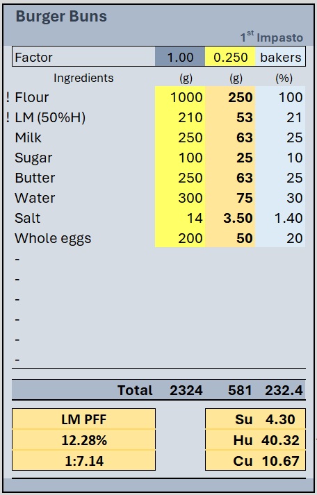 Total flour not including the starter was 250g (75g 10% protein (Wildfarmed) / 175g 15% protein (Le5Stagioni Manitoba 00)). As I didn't account for the egg addition, next time for 6 buns I would go for 240g of flour. Buns were scaled at 85g each.