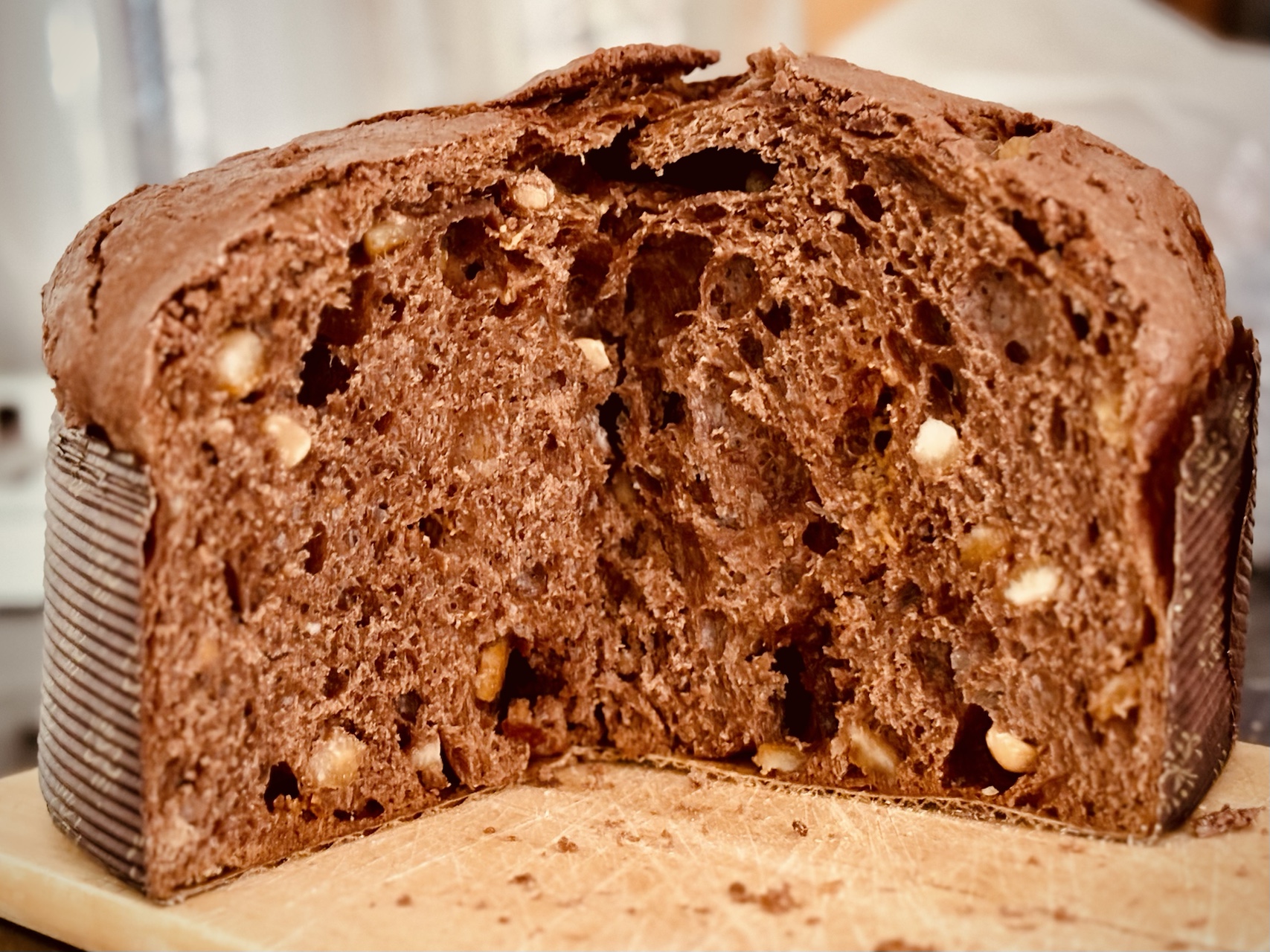 The crumb was unfortunately only very slightly shredy. Probably because at the end I added too much water (bassinage additional 5%) to the main dough. My Dallagiovanna Panettone flour obviously cannot handle as much water as I would like to. Or my process was not good enough.