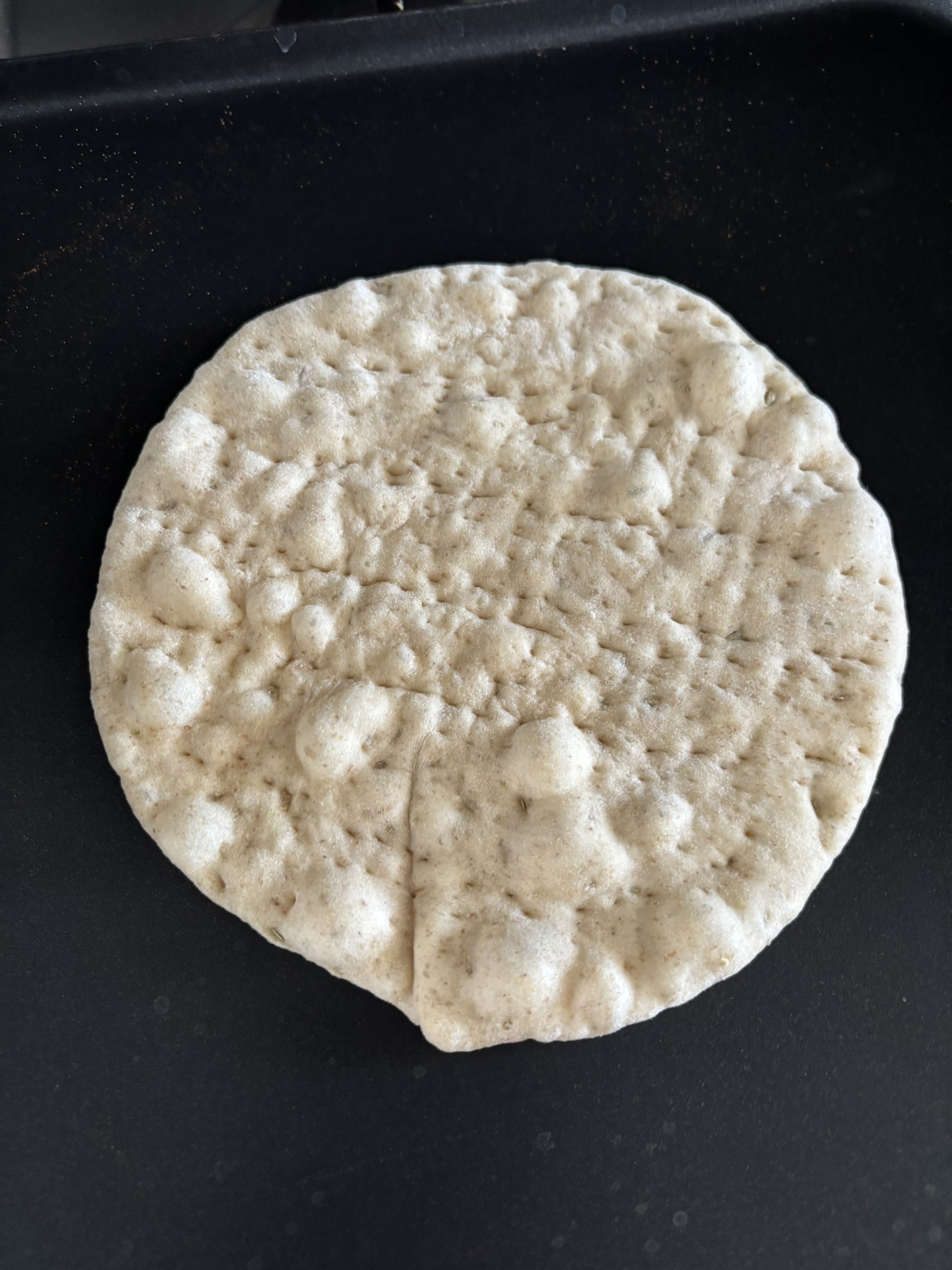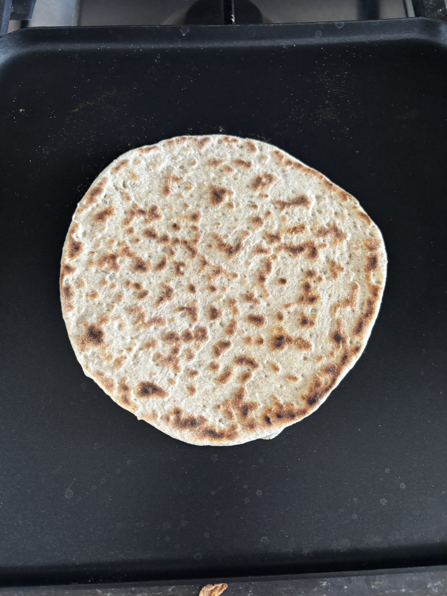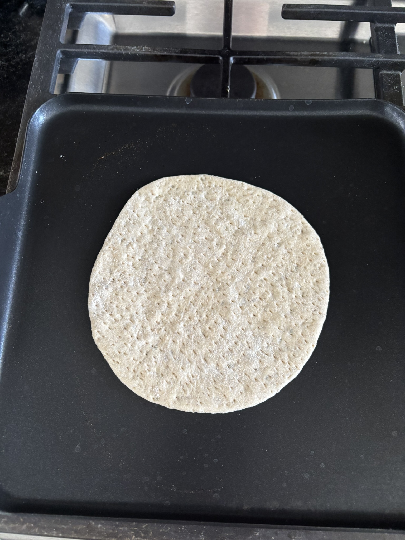 While the rounds relaxed, i preheated a griddle over medium heat.  I rolled out the first round to approximately 1/8 inch thick and docked the entire surface with a fork.  It was then placed on the griddle.
