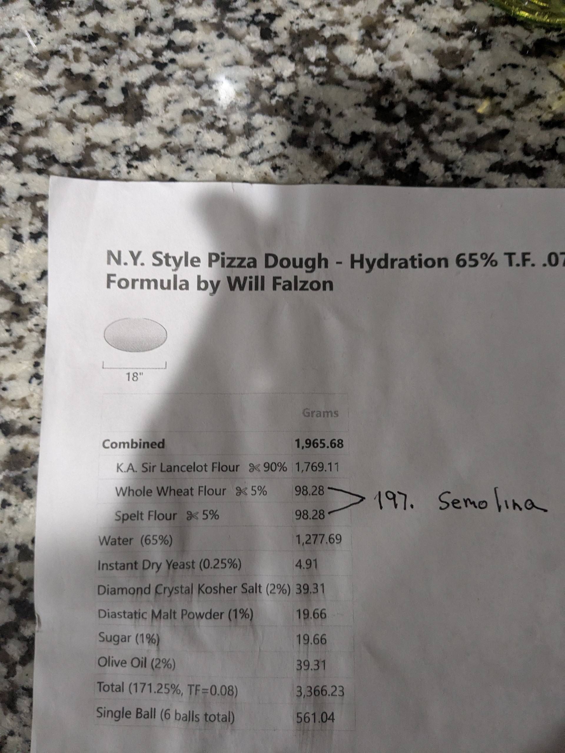 I took a photo of the ingredients for you. Changing the bake time changes the texture some. I do not find this formula to chewy. As far as eating cold pizza. I prefer it to reheating. Rarely are there any left overs to eat cold for breakfast.  These days the formula is exclusively high gluten and extra fancy Durum wheat,( semolina)
