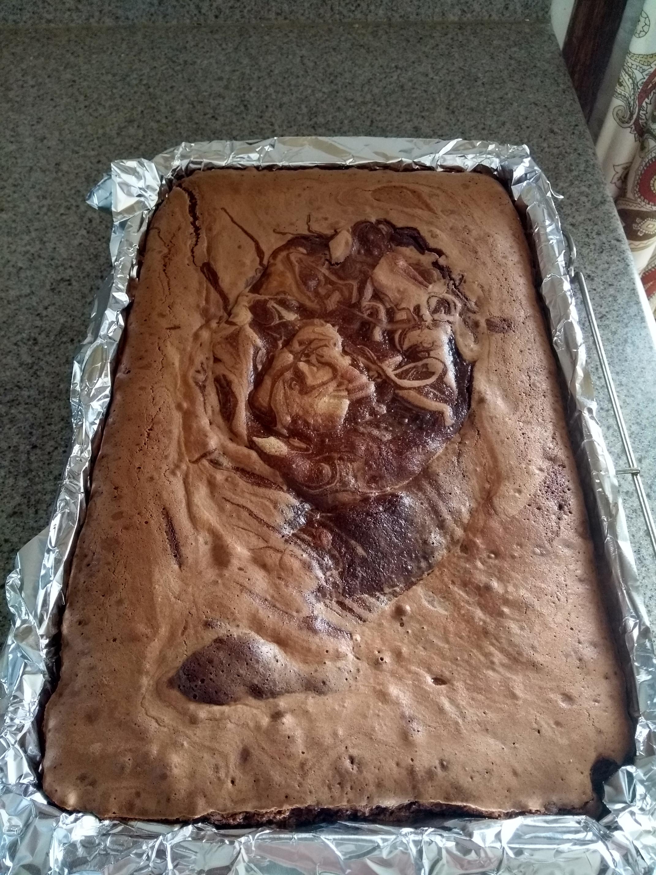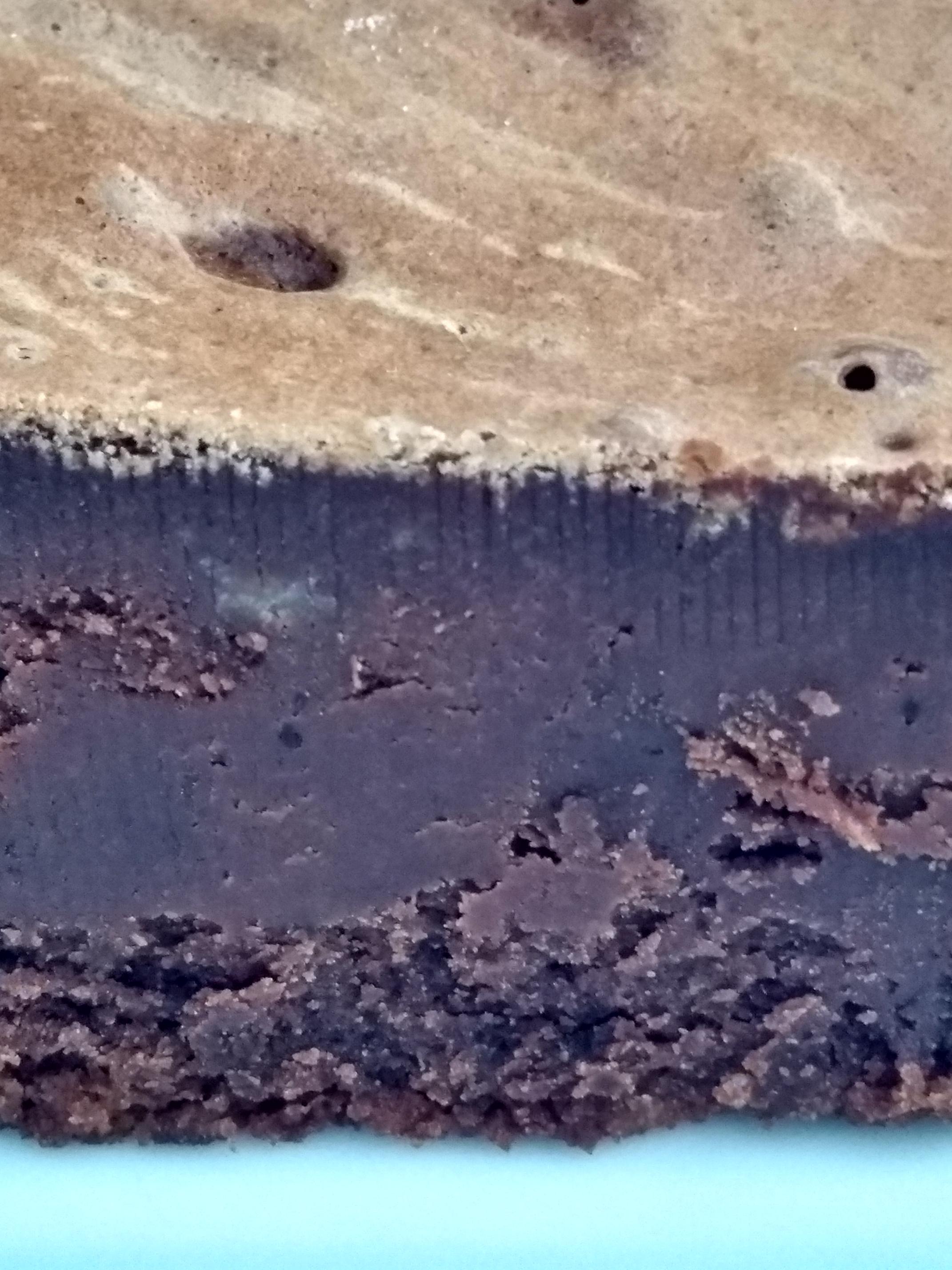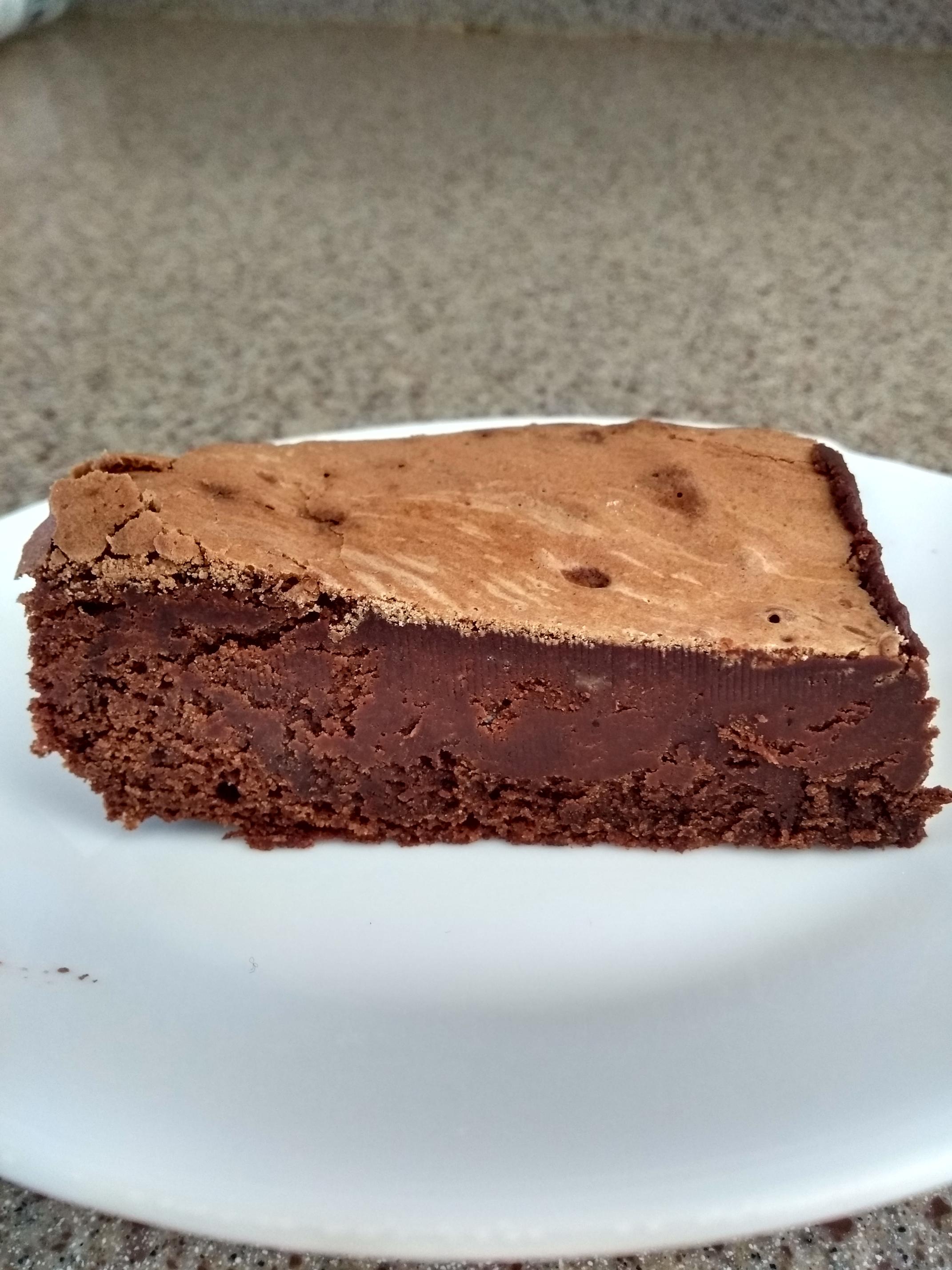 Prompted by Debra Wink's blog entry about chocolate & egg white (which looks delicious), I'm posting a similar, yet dissimilar, treat that shows the versatility of eggs. This prize-winning recipe was created in 1986 by Barbara Feldman Morse and is called San Francisco Fudge Foggies. Here's an online recipe. I used the microwave instead of double-boiler, salted butter instead of unsalted, and no nuts. The funny pattern on top--which to my poor eyesight looks like onion rings 😊--resulted from an accumulation of chocolate in the bottom of the mixing bowl that had to be scraped out on top. The fudgelike density of the interior is due to the movement of the knife. If the "brownie" was broken apart, the consistency would be the crumblike lower part of the shot.
