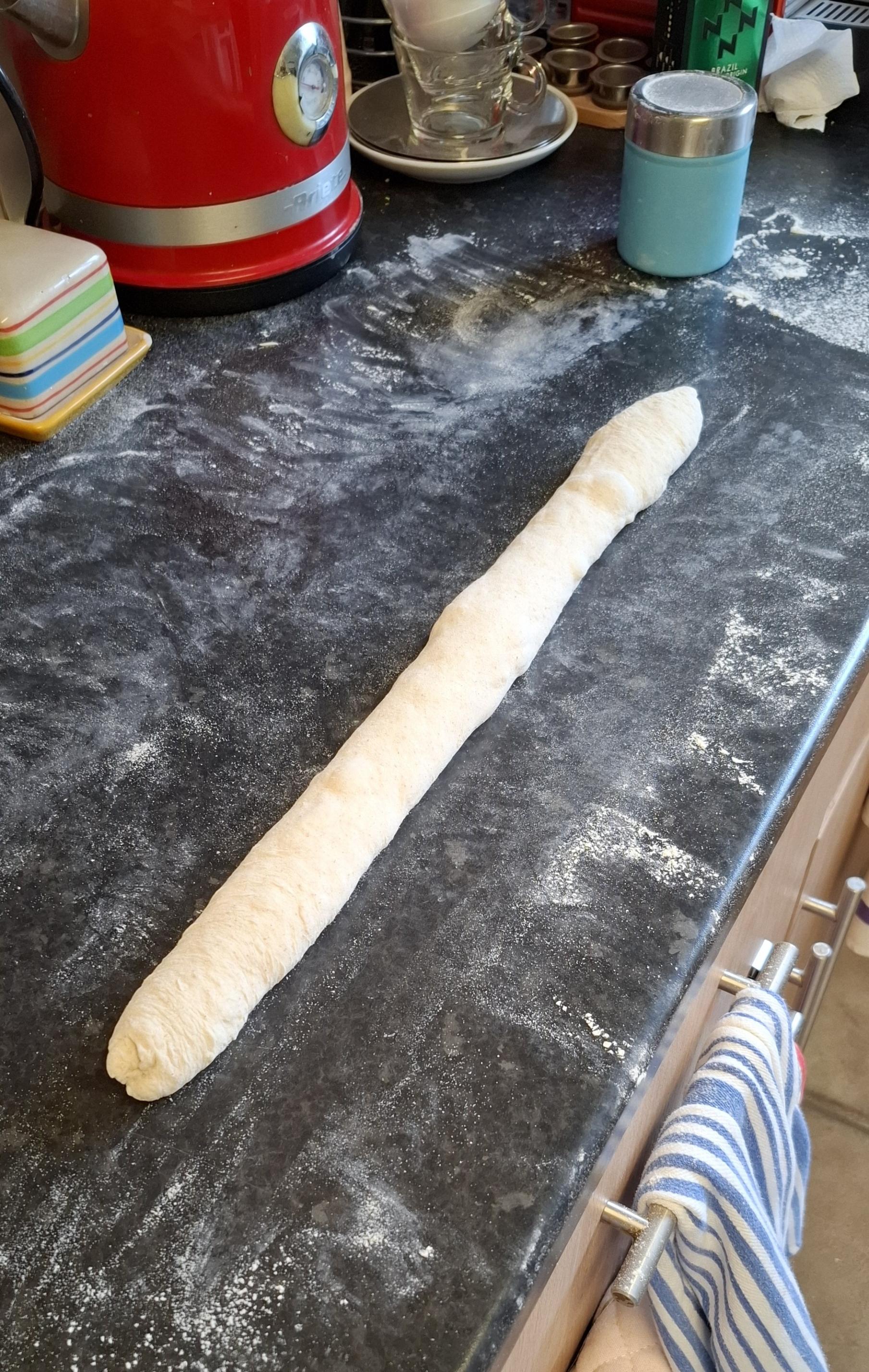 Note that I didn't roll to 60cm but 40cm as I don't have a wide oven. Achieving those dimensions and weight can be tricky in a domestic setting especially with sourdough.