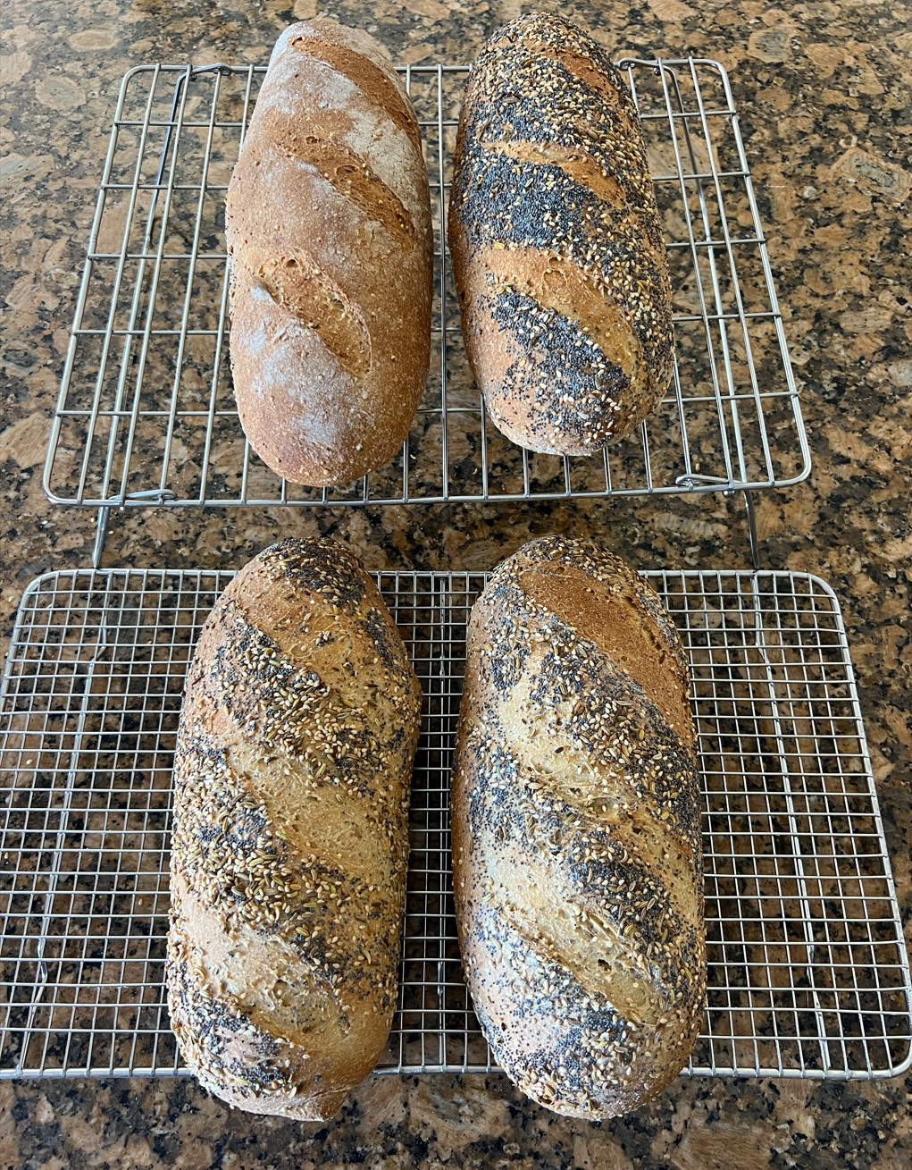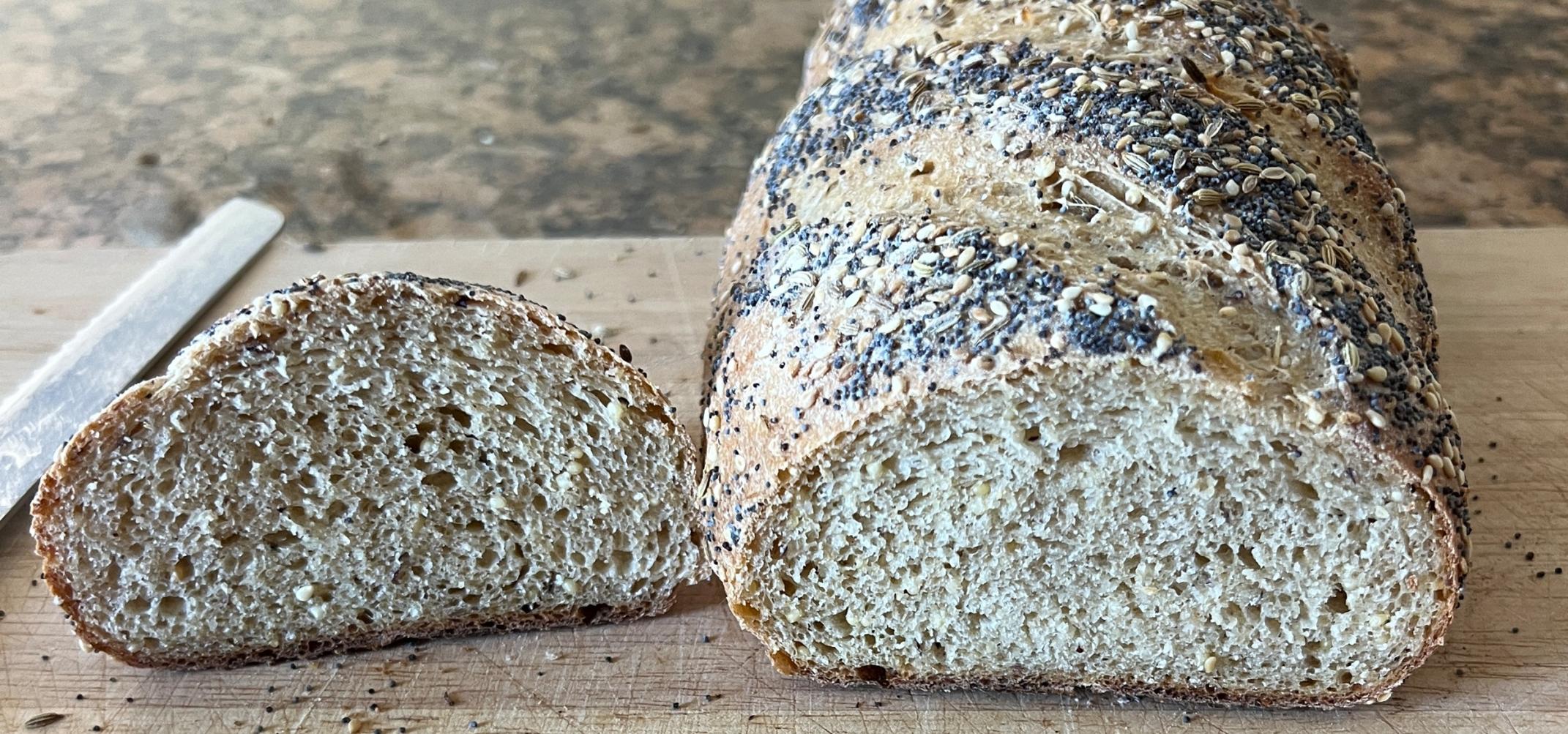 Discussion: I've been wanting to make a durum bread for some time and selected this one. It's pretty straight forward with a pâte fermentée, a soaker and the final dough and comes together rather quickly. The crust and crumb are both tender and soft. To me durum has a slight buttery taste. The sesame seed adds a nice nutty flavor, the caraway seed adds a savory note, and the poppy seed a nice crunch to the bread. I think this would go well with light cheeses, milder meats, or to go old school just dip it in some extra virgin olive oil.