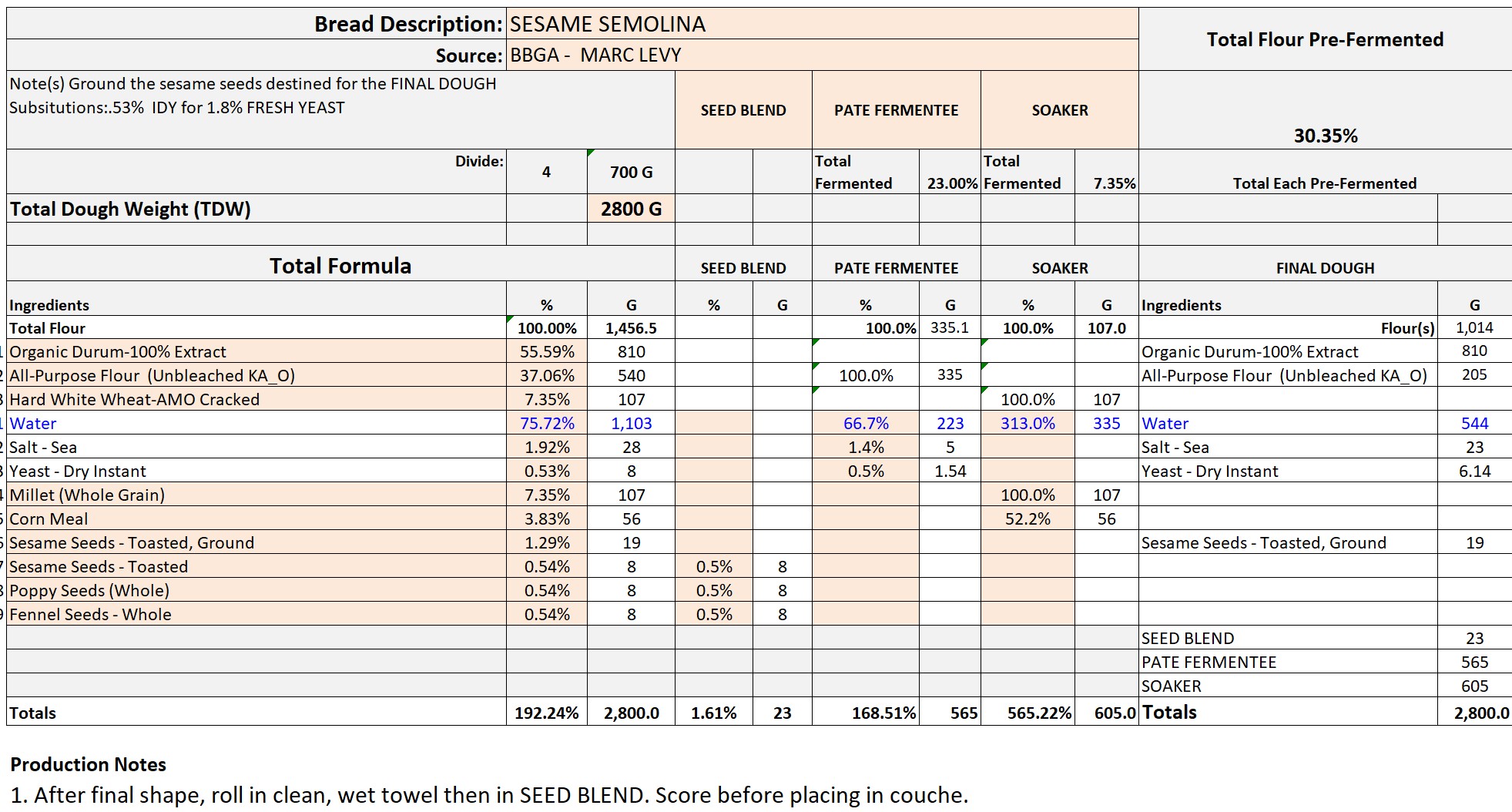 Substitutions: .53% IDY for 1.8% FRESH YEAST