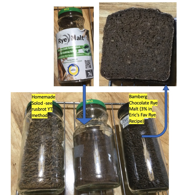 I buy the solod or "fermented rye malt,  red rye malt".  I usually use solod in a scald step. Ebay had the brand below a few years ago. I believe others at tfl have used this too. This solod is the middle jar and its color and processing is distinct from a plain roasted rye malt (like the Bamberg rye malt on the end).  The solod scald certainly contributes to Borodinsky's color (freshly milled whole rye and whole red hard wheat also have a part in loaf color).