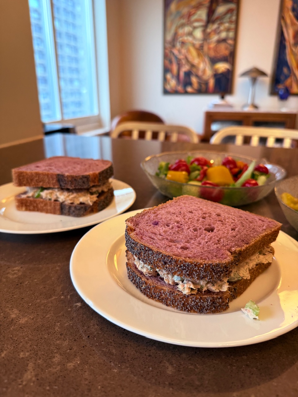 The sandwiches are tuna salad which I made with pickles, celery, pickled onions, dill, kewpie mayo, lemon juice and dill.