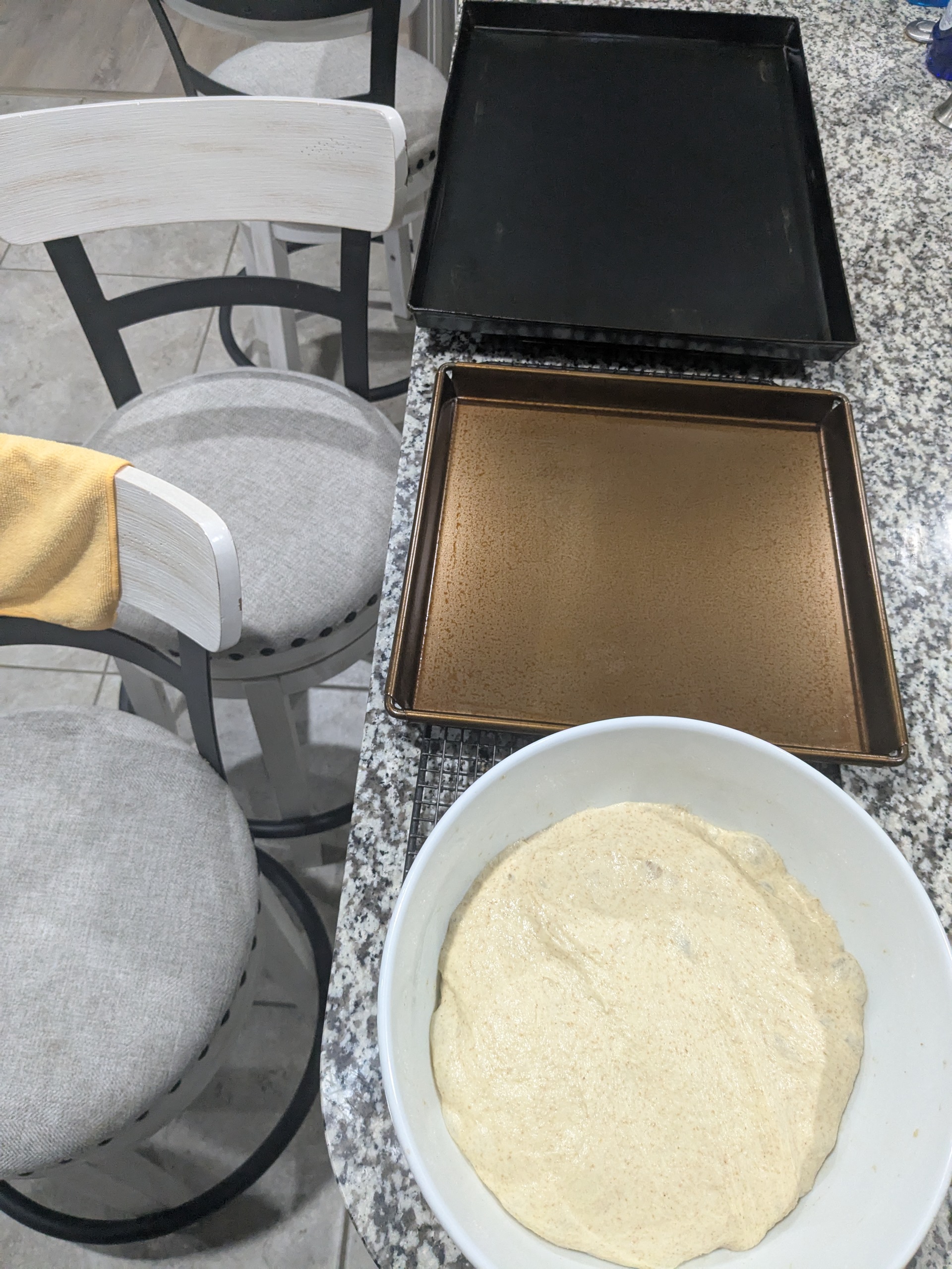 All systems go! Both pans were seasoned times three on the interior. Times one on the exterior. The semolina/whole wheat dough is looking good and elastic. She is waiting on the pan to cool down. ETA until par-bake 90 minutes.