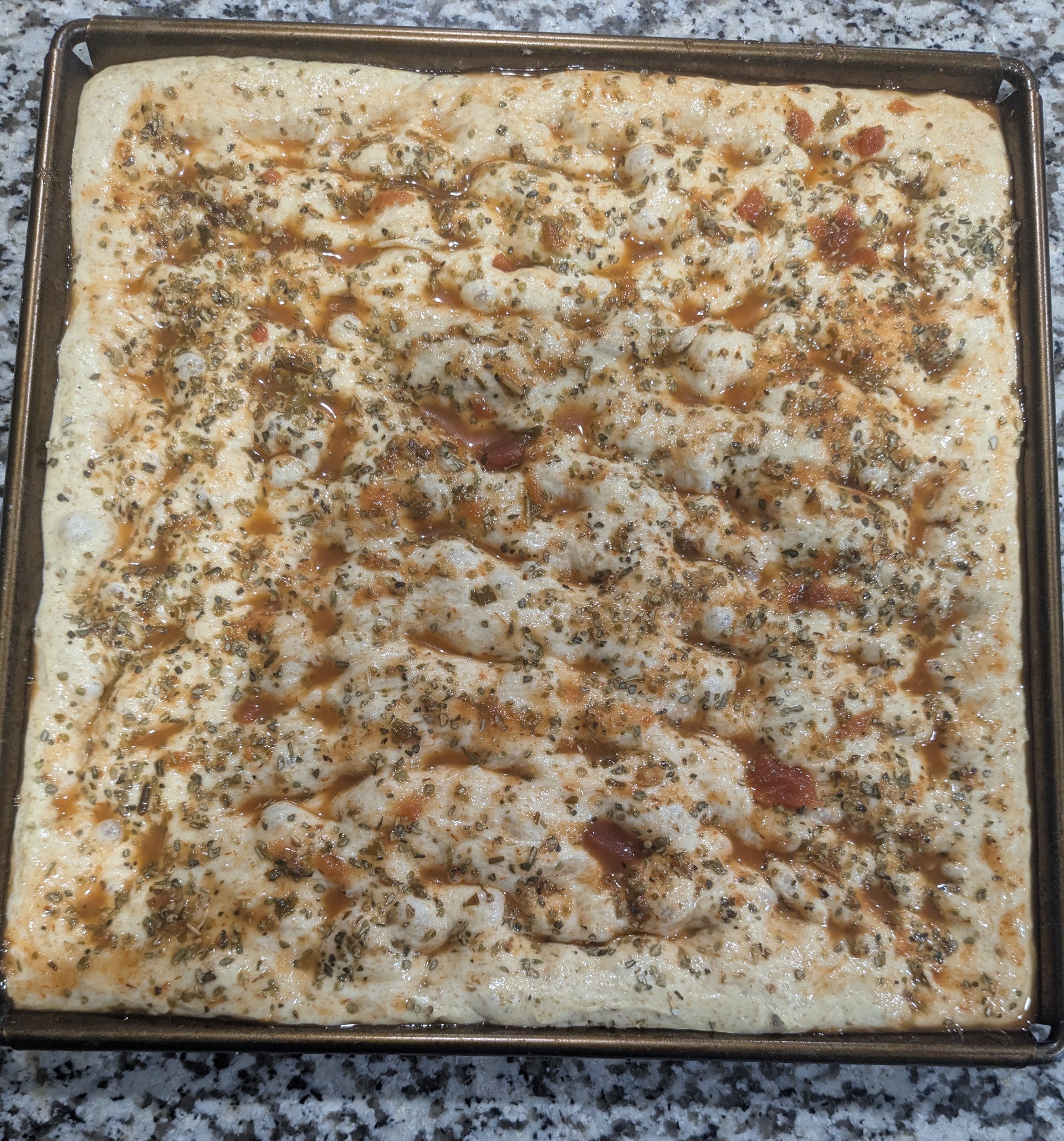 The formula produced a wonderful fluffy base! The seasoned pan preformed flawlessly on her maiden bake! Even the watered down sauce that got between the dough and pan didn't stick!