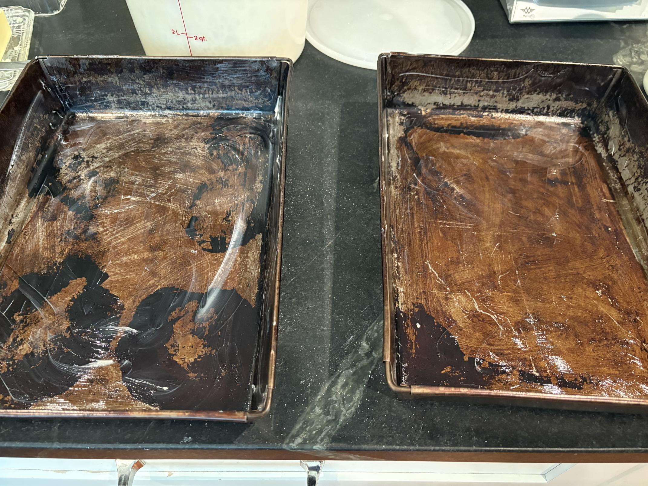 2000 g of dough makes one big sheet 1000g and two Detroit deep pizza crusts 500g each . All my pans look “ rough” but they bake up nicely. I butter just like I do my Pullman with cold butter and the crust will crisp nicely and no stone needed or special treatment.