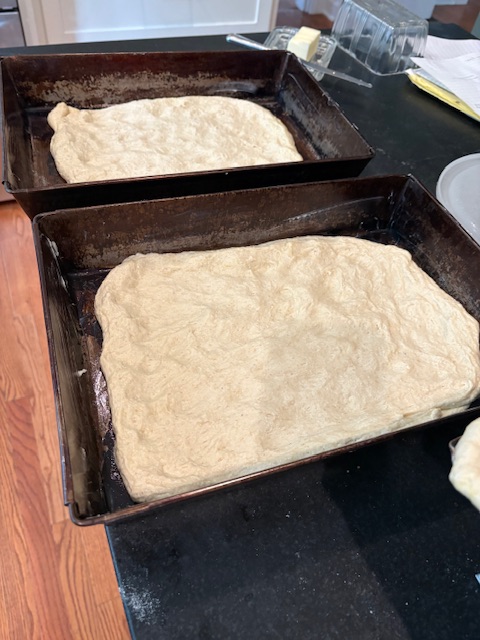 I pat out cold retarded dough in the buttered pans and then let it rise for several hours slowly on the counter. Brushed well with EVOO. Par baked at 425. When cool I freeze and when I’m making a pizza the topped crust goes in the oven directly on the rack with a sheet pan on the rack below to catch drips. This ensures the bottom will be light and crisp.