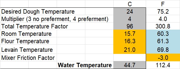 Today, my kitchen at 0600 was 15.7 C, flour temperature 16.3 C and levain 21 C. I needed to heat the water to 44.7 so I could get a final dough temperature of 24 C. It worked out exactly.