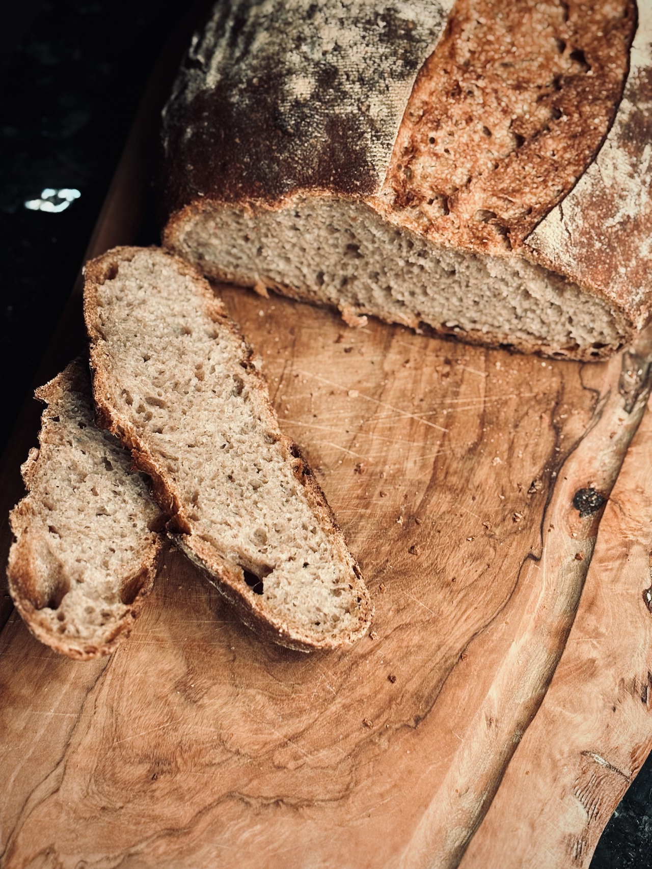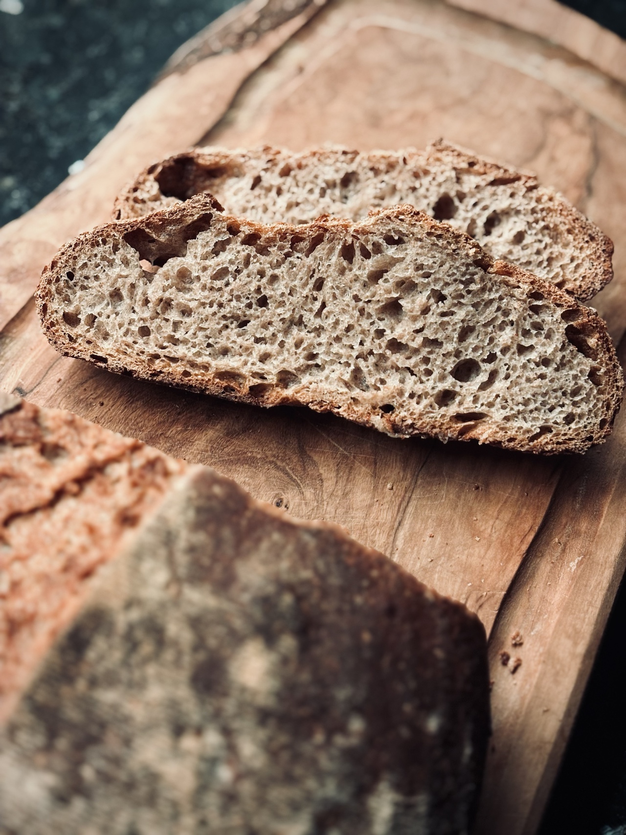 Crust & crumb look fantastic! I can imagine the flavor is superb. Great prresentation on the rustic cutting board, too. Congrats!