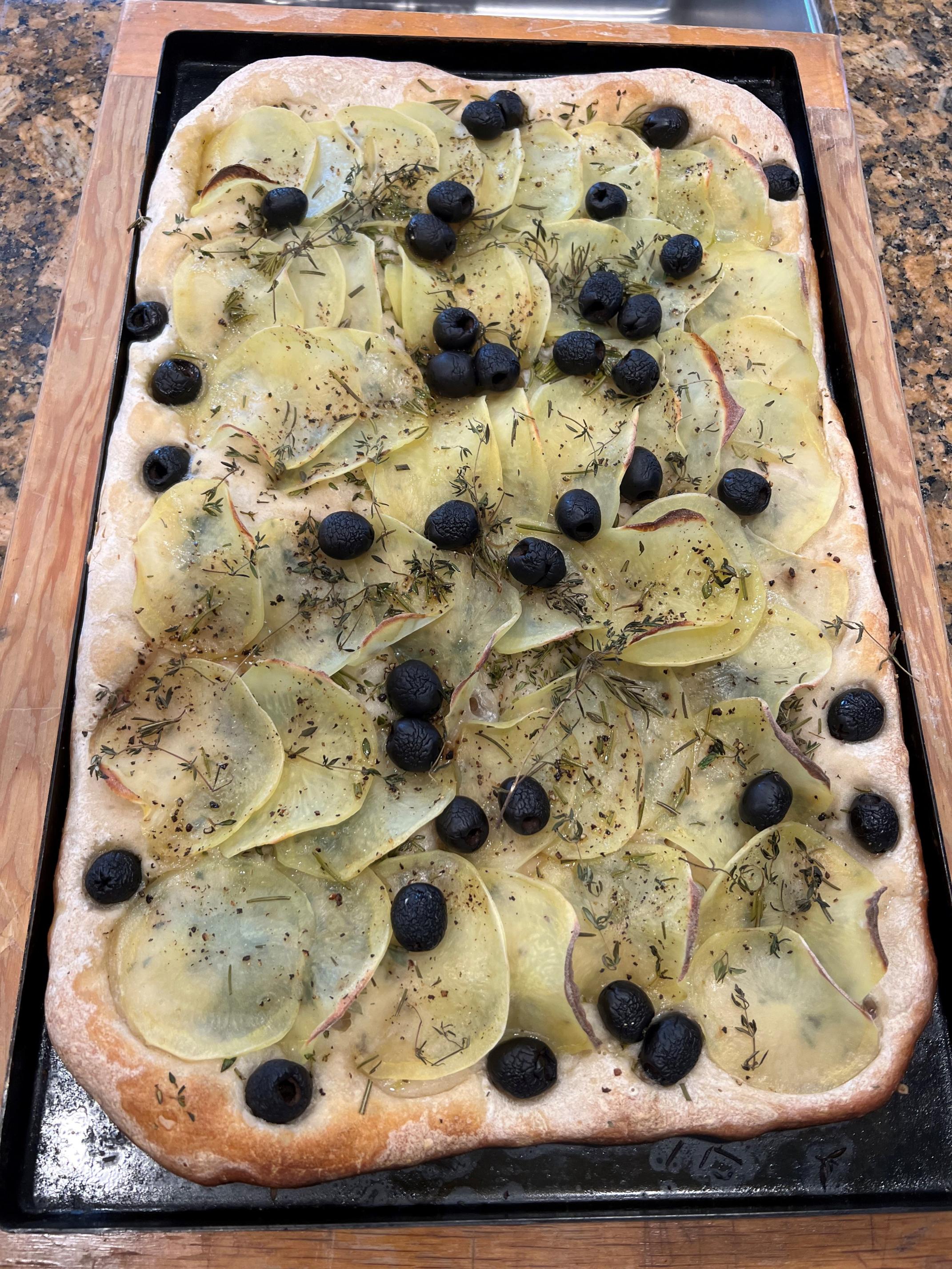 Benny - I sliced the raw potatoes really thin using a mandolin. I had to go back to 2022 in my photos. In retrospect I should spread the olives better.  Details are below.