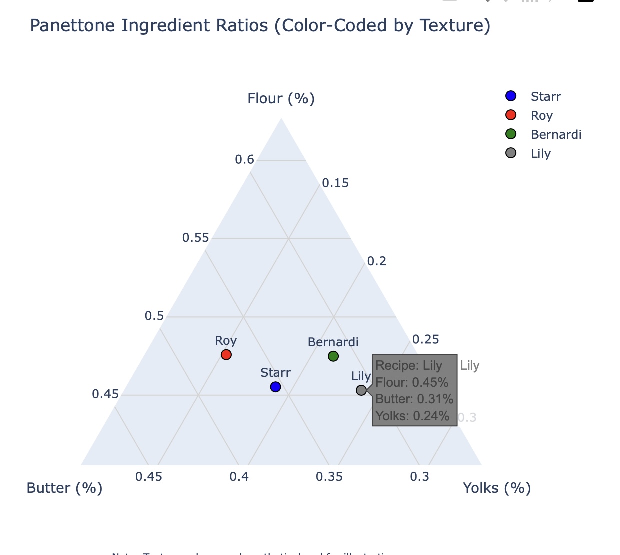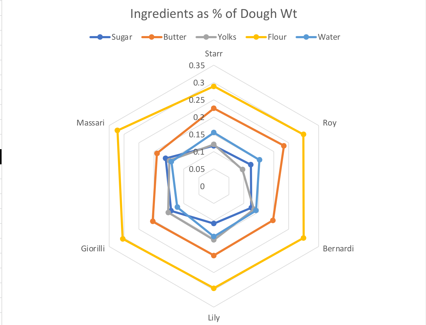 The new recipe (Lily) is skewed toward the yolk corner, as expected. Roy’s recipe, notoriously lower in yolks and higher in butter, is also relatively higher in flour relative to enrichment. A recipe attributed to Bernardi online is higher in both yolks and flour. My own recipe is more central with yolks and butter and a bit lower in flour.