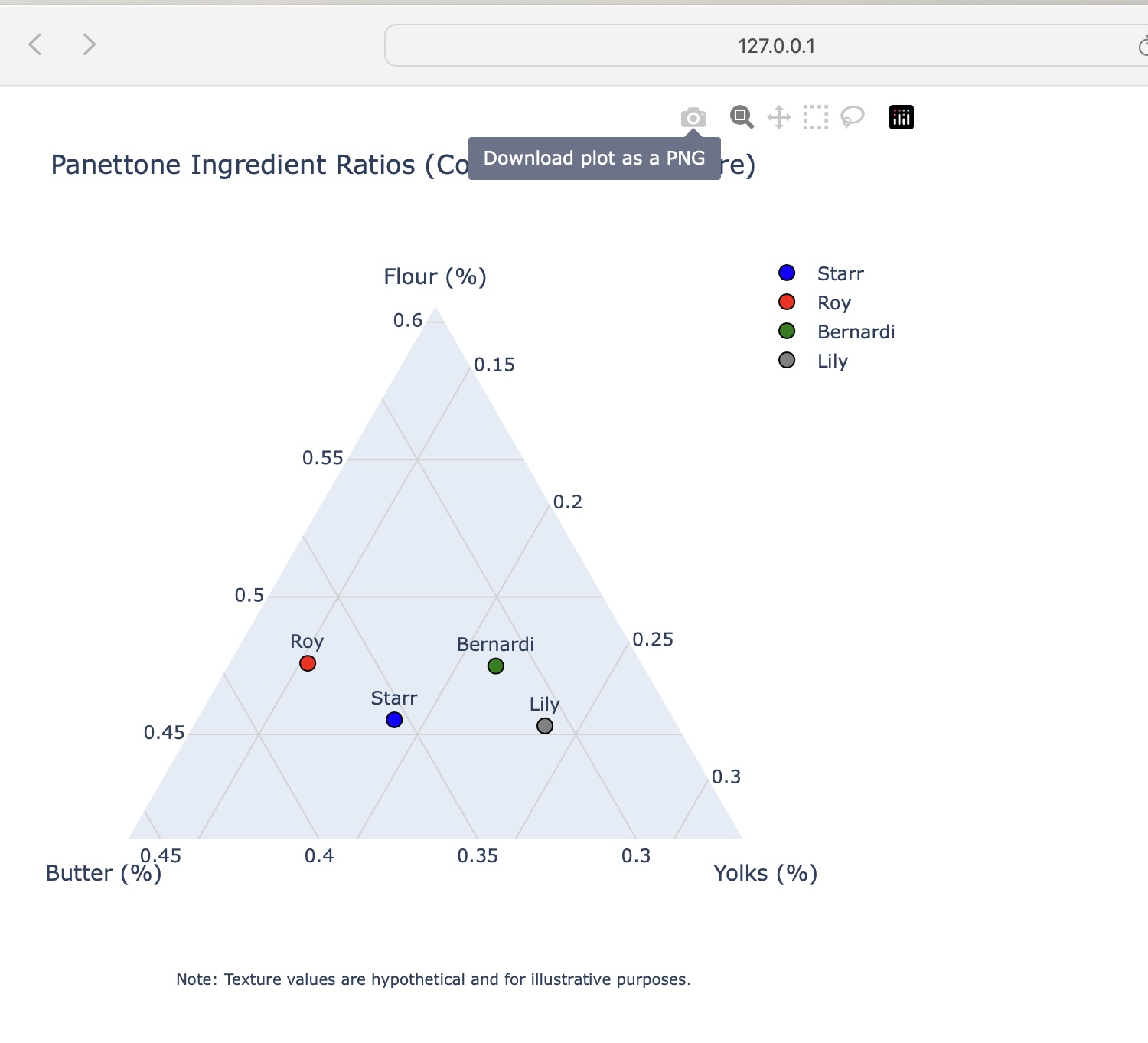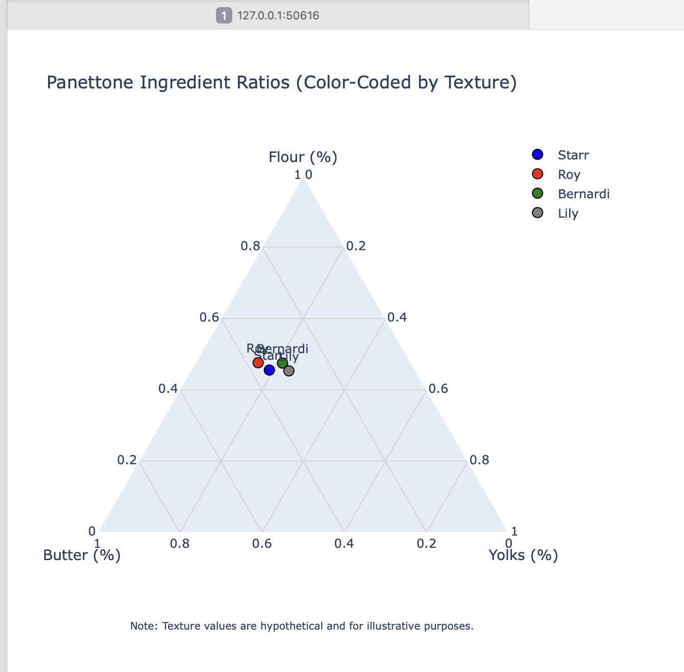 I have a number of other ternary plots in development, that should shed more light on the process. For now, I have a few insights to apply to my own bakes and more programming to do! (For instance, gray wasn’t the best color coding selection)..