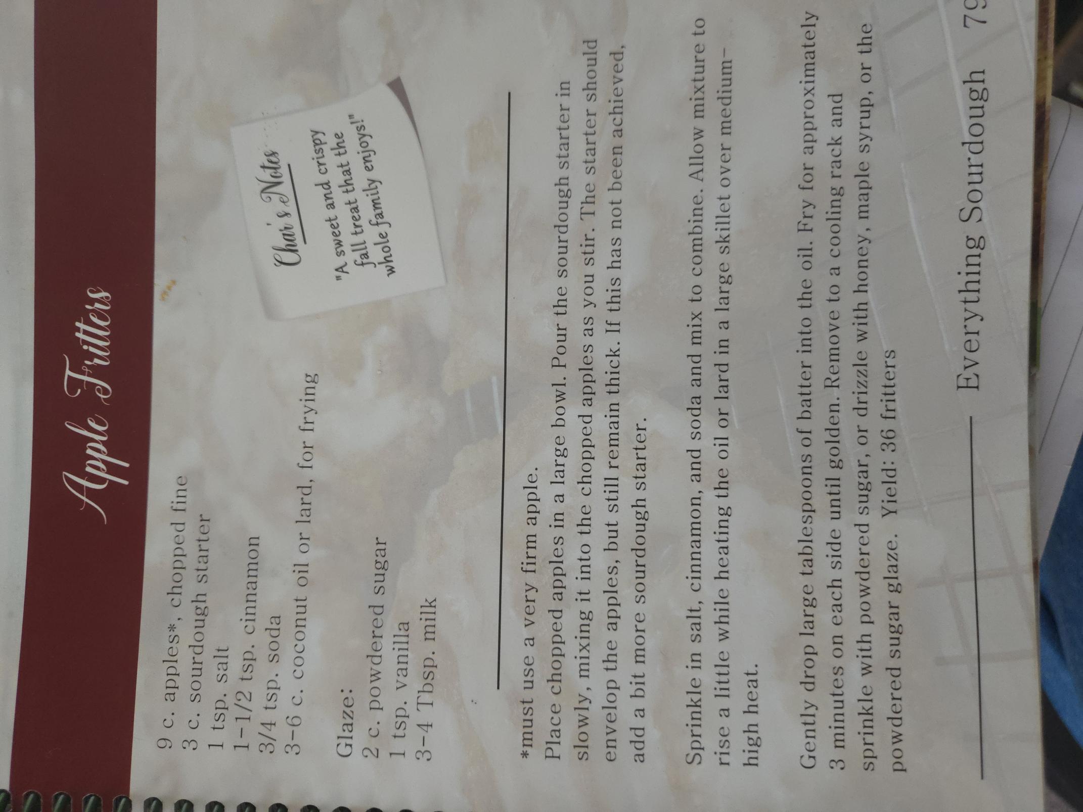 720g starter at 100%, 9 apples finely chopped, 3/4 tsp baking soda, 1 tsp salt, 1 1/2 tsp cinnamon, 3-6 cups frying oil.