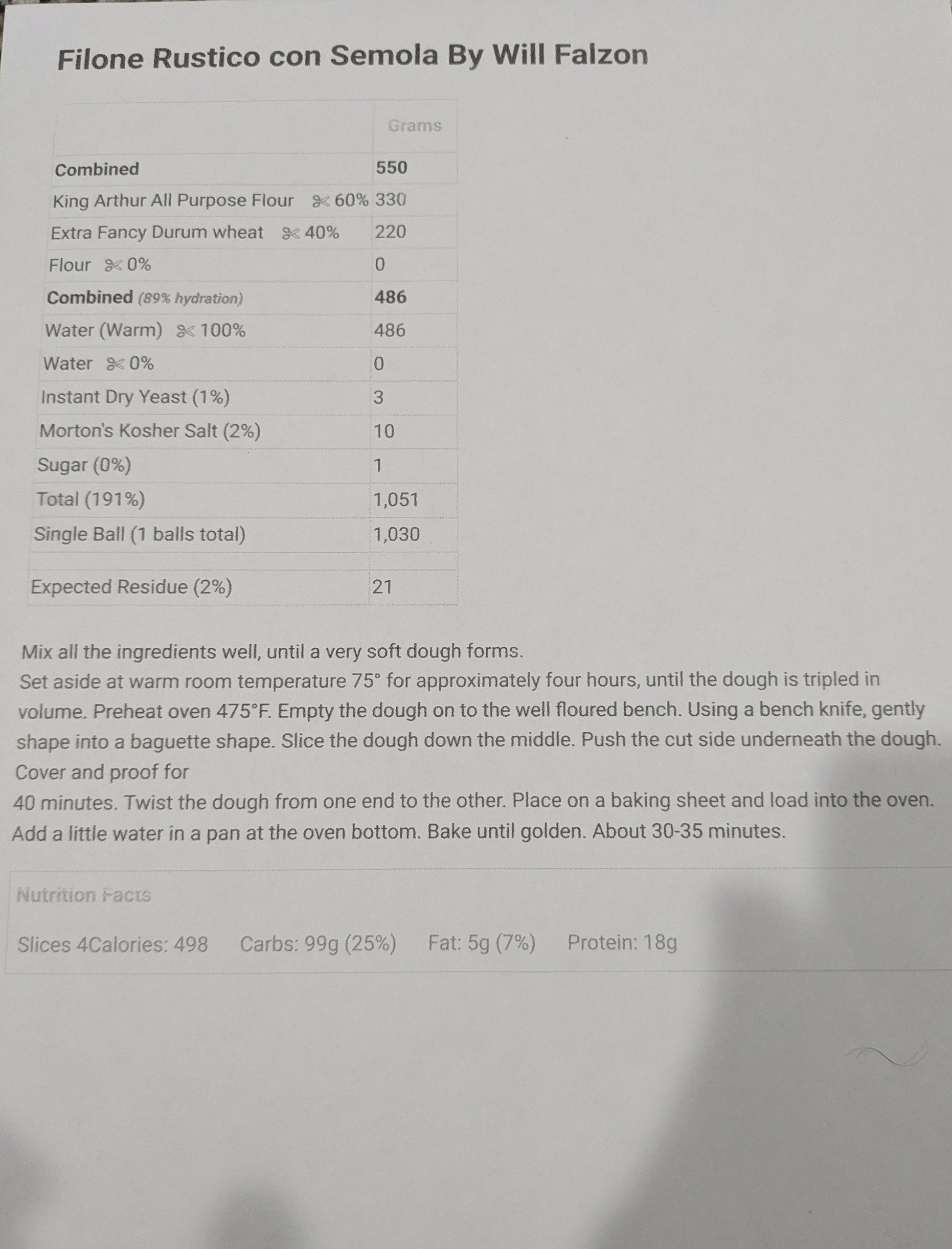 Parisian baguette, Filone Rustico con Semola