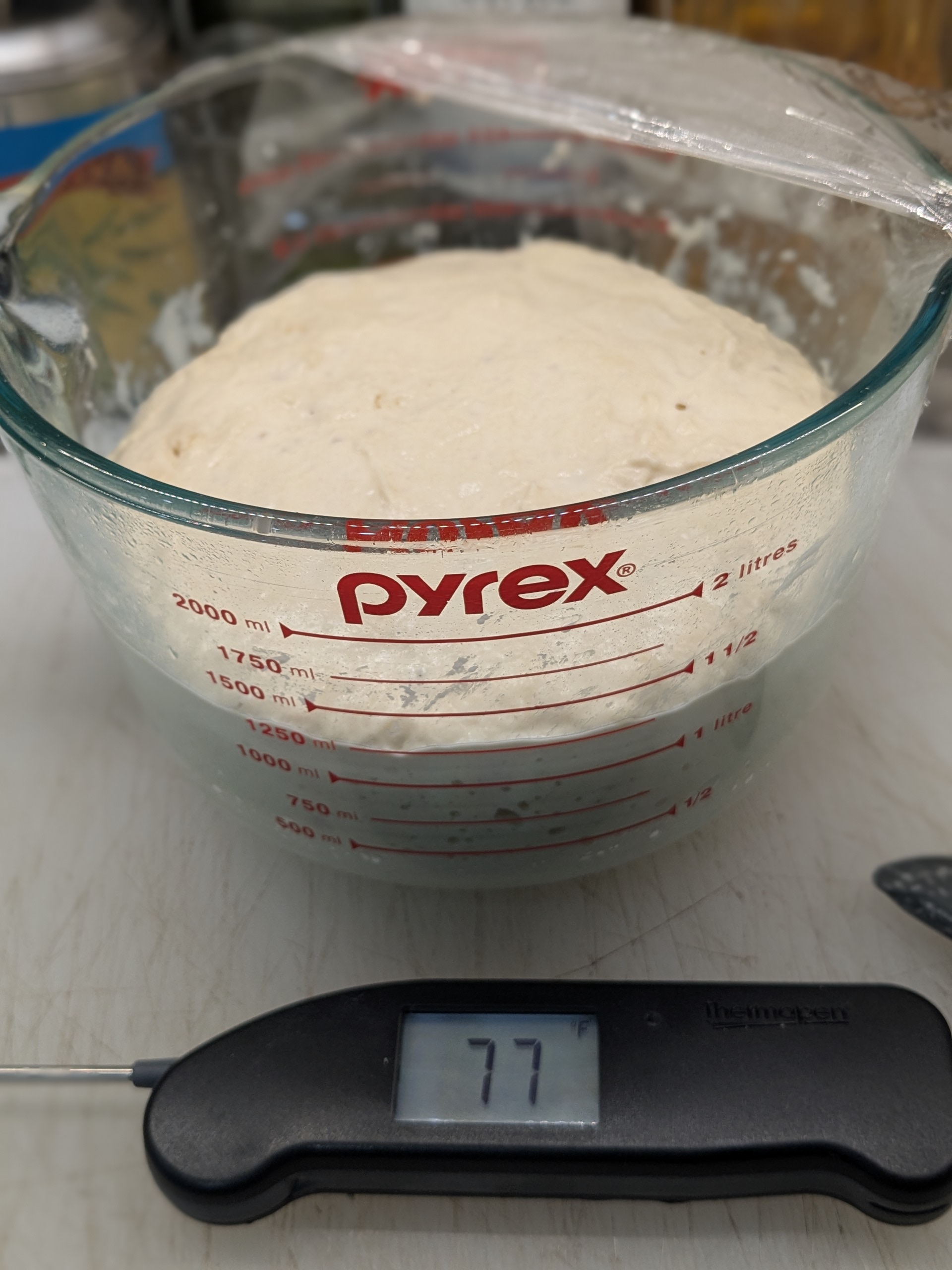 With just about 60 minutes to go in the Filone bulk the dough is very active and more than doubled in volume.
