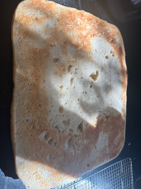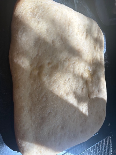 Apple yeast water and sourdough equal amounts 230g each . Dough 1/2 semolina 1/2 Arrowhead Mills Organic AP. 425g each. 600 g water ( used 100g YW as part) . 21g salt, 40g EVOO, 20g Non diastatic malt . That’s it. Mix everything til thoroughly wet. Refrigerate 1 1/2- 2 days . Butter large sheets divide dough approx 1000g per pan. Press out , rest several hours til very puffy. Brush with EVOO parbake in preheated 450° oven 15 min . Freeze one and top the other.